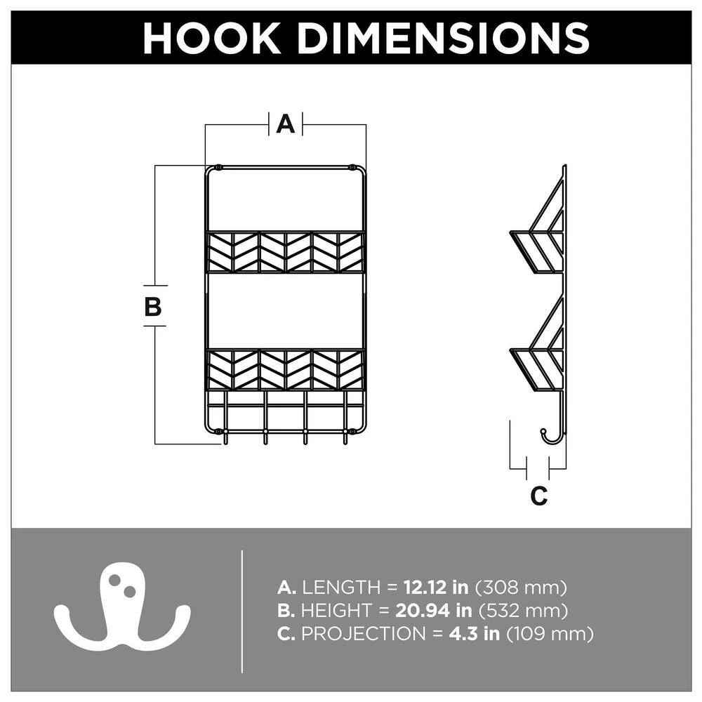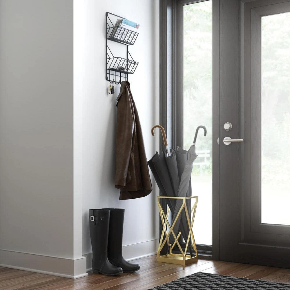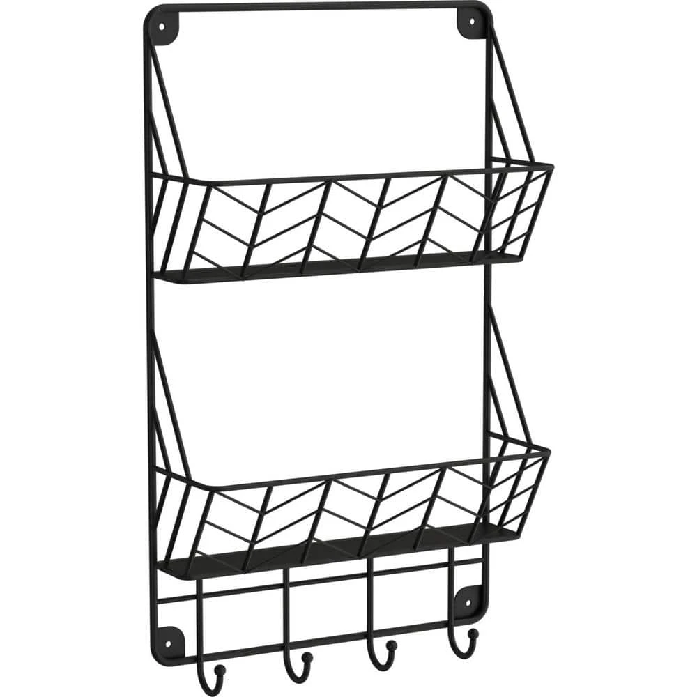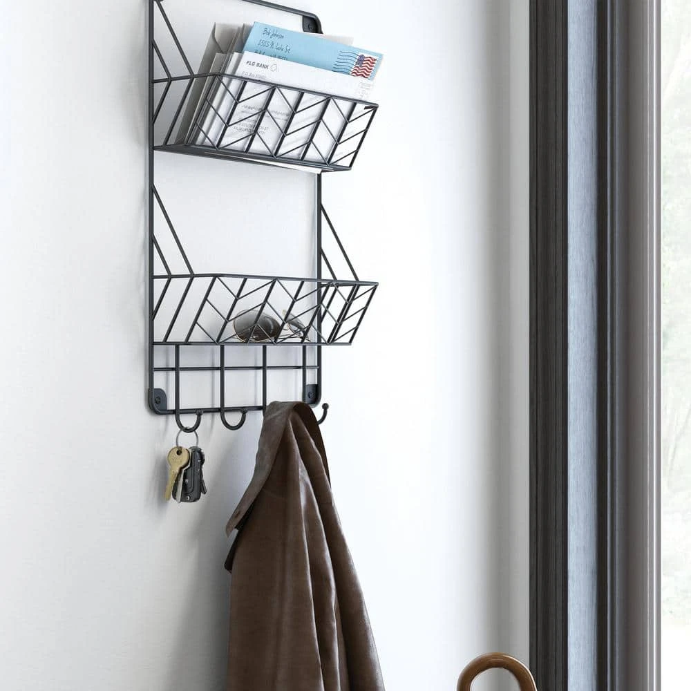Inspired by schoolhouse industrial decor, the double basket organizer, in a Matte Black finish, gives you the ability to organize with style. This versatile organizer has 2 baskets for your mail or magazines as well as 4 hooks to hang your light jackets, keys and more. For ease, installation hardware is included.