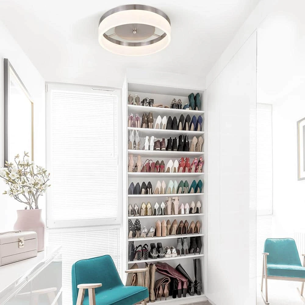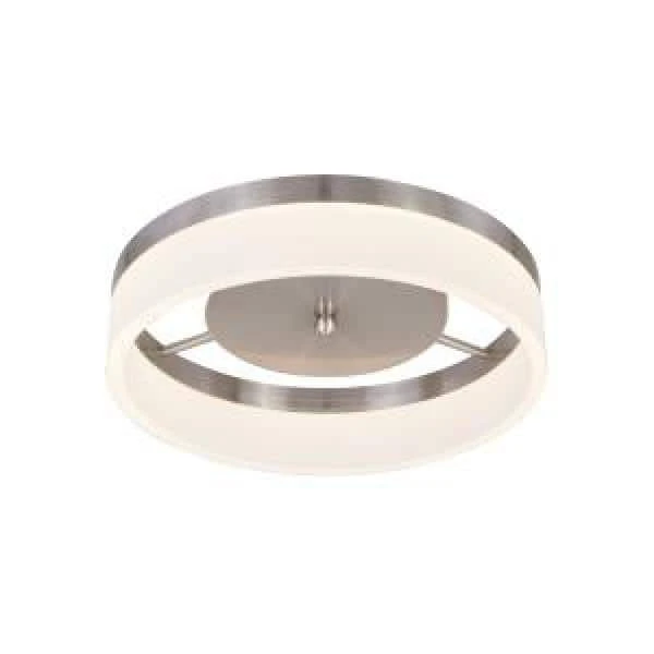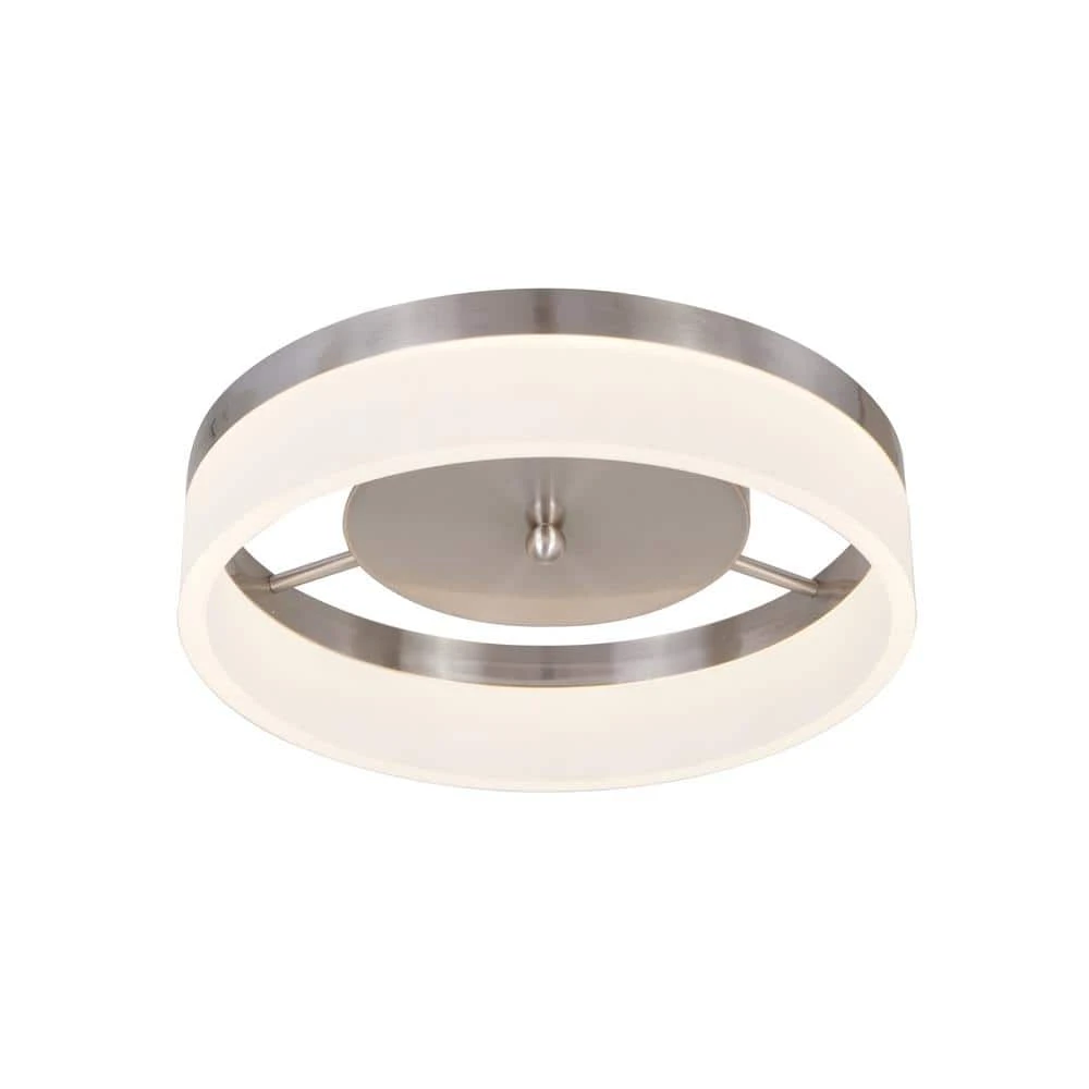Open frosted acrylic round shade is suspended from the brushed nickel finish of this modern LED flush mount ceiling light. The look of this contemporary design will set the mood in any room with soft, ambient light. This modern-piece will transform your dining room, kitchen or bathroom, but is also the perfect decorative touch to any hallway in need of a little refresh. Updating the lighting in your home is the most effective way to accomplish a striking, yet simple, DIY remodel.