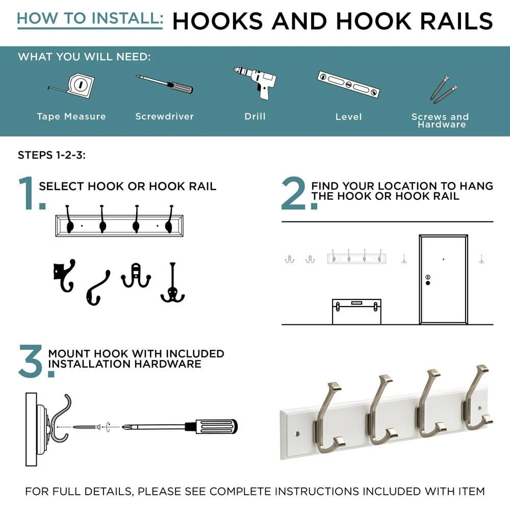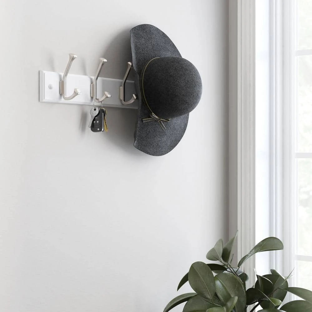 - Bright white rack with elegant satin nickel hooks adds style and class