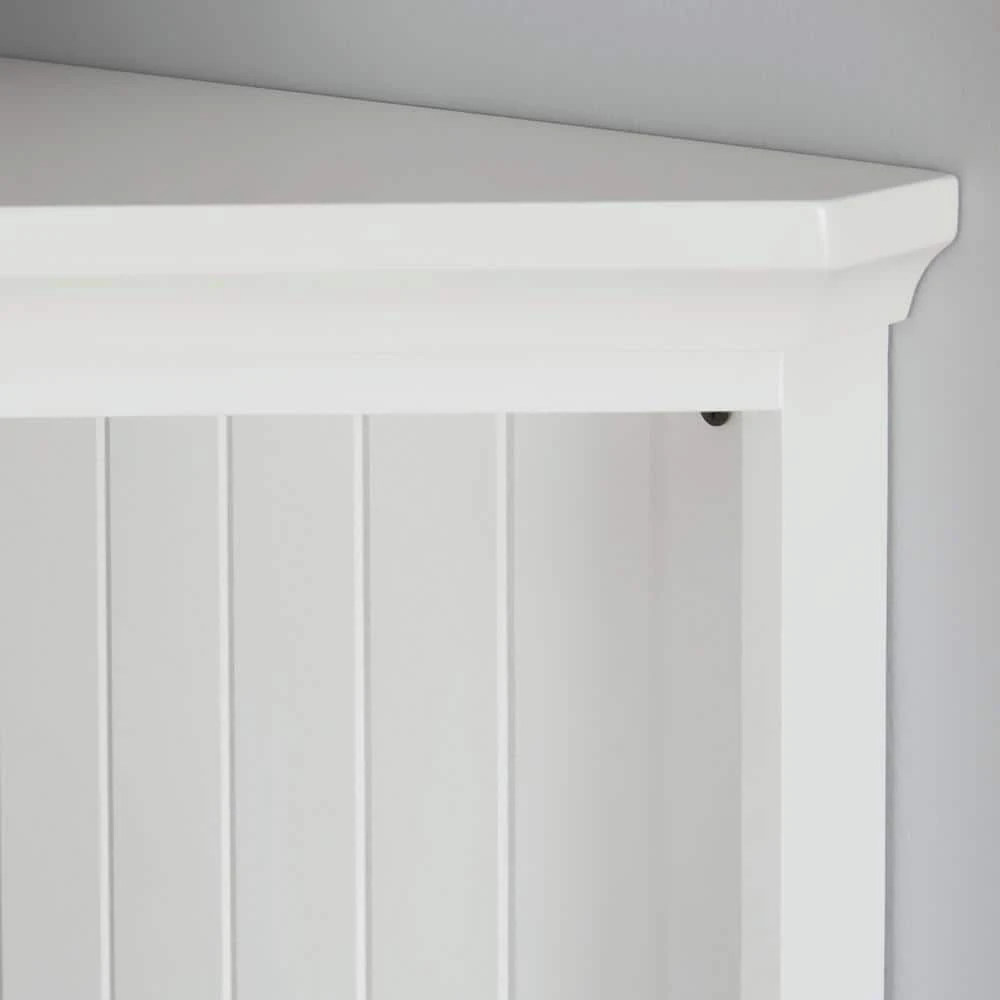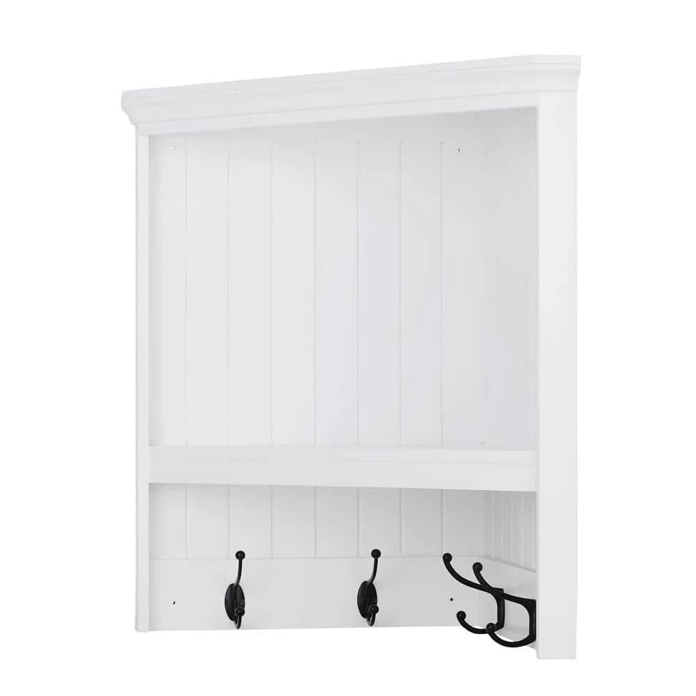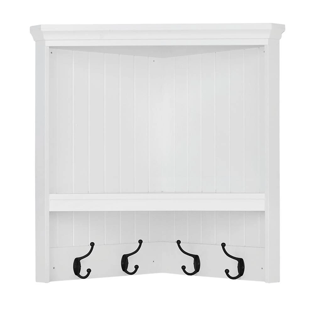Organize and display various items with this large white HDC corner decorative cubby wall shelf. The floating design blends easily with the clean lines of your modern space. Designed for L-shaped corners, this convenient cubby maximizes your space while adding a sophisticated touch. Hang your bag, hat and keys on the four built-in hooks. Solid wood construction offers lasting use, and a shiplap veneer delivers casual charm. This ready-to-install HDC corner decorative cubby wall shelf arrives preassembled for easy mounting.