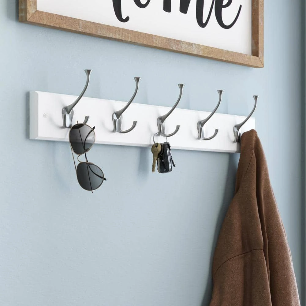 Looking for ways to increase storage and scale back clutter. This decorative rail with 5 flared tri-hooks is designed to hold a wide variety of items like coats, hats, handbags, umbrellas, towels or robes. This casual design is perfectly suited to match the decor of any room in your home.