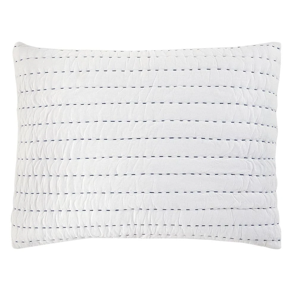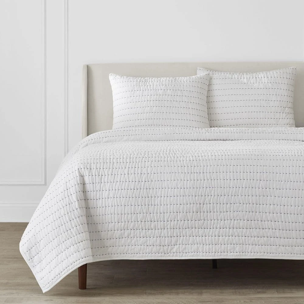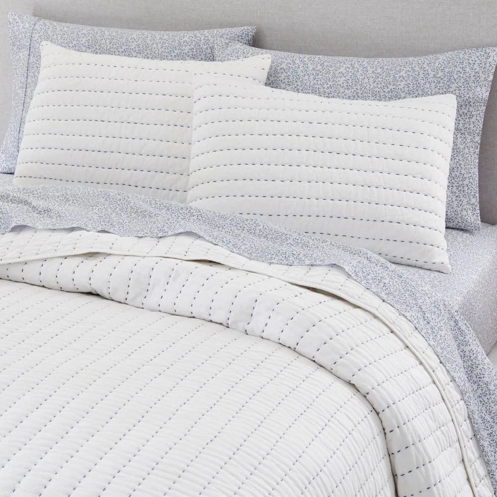Wrap yourself in ultimate comfort and soft texture with our unique, hand-made Home Decorators Collection White and Lake Blue Pick-Stitch Cotton Quilt Set. Using meticulous hand-quilting and pick-stitch methods, each quilt set is uniquely crafted, and the 100% cotton construction is ultra lightweight and durable. This white quilt set can be used on it’s own for those who tend to sleep hot, and it can also be easily layered to create a cozy restful retreat. The options are endless for styling, as this white quilt set can be paired with numerous different throw pillows and blankets to complete your favorite look. Two standard pillow shams and an ample quilt make it easy to set up your guest room or master bed, and the machine washable construction is effortless to maintain.