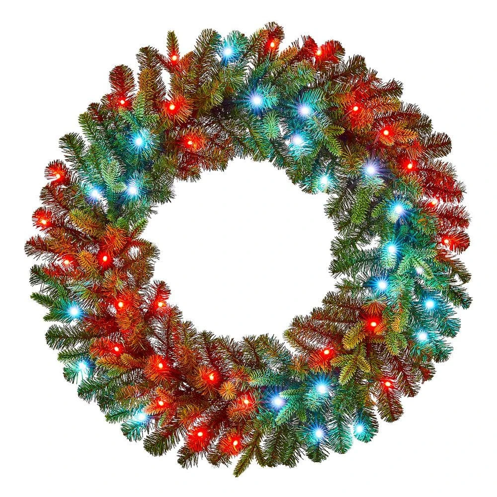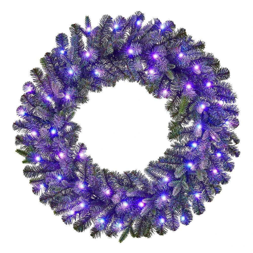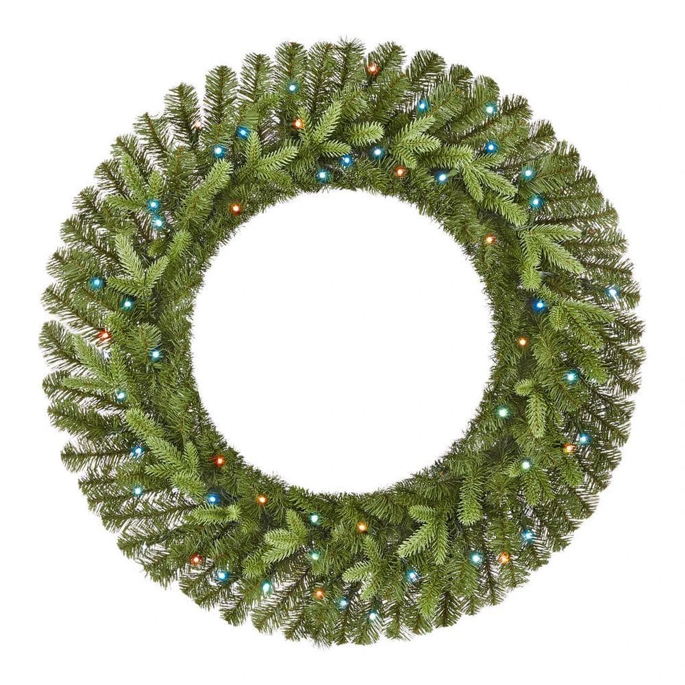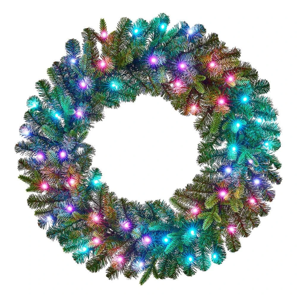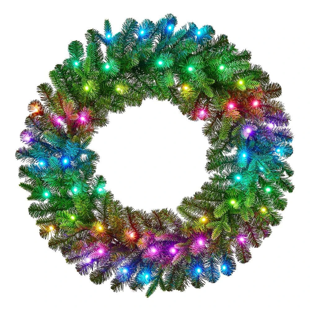 Create a cozy Christmas welcome with this Swiss Mountain pre-lit artificial spruce wreath. Lit with 50 app-controlled Twinkly RGB LED bulbs, this wreath emits a joyful glow upon your indoor or covered outdoor spaces. The generous 30-inch diameter greets your guests with an eye-catching touch of greenery. This Swiss Mountain pre-lit artificial spruce wreath features 224 artificial spruce tips, supplying a lush, realistic look with plenty of room for personal decorative additions.