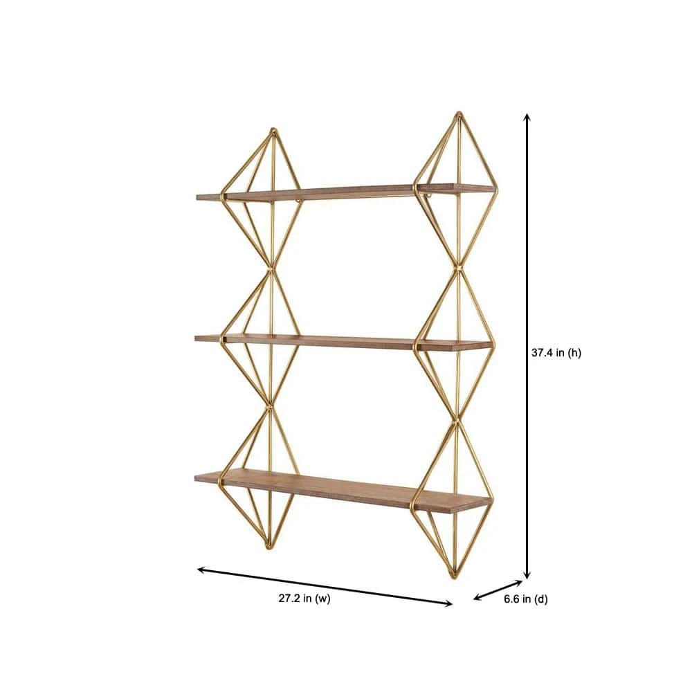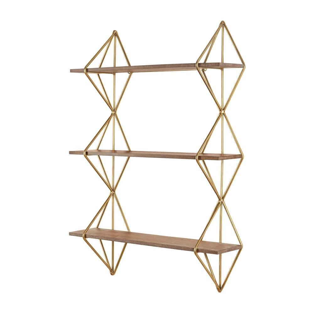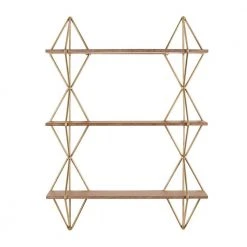 The Home Decorators Collection Wood and Gold Metal Wall-Mount Bookshelf perfectly displays your photos, books and more. It features a unique design with three shelves, gold metal framework and wooden shelves. This shelf is perfect for your living room, kitchen, bedroom and more, plus it’s simple to hang with ring hooks on the back.