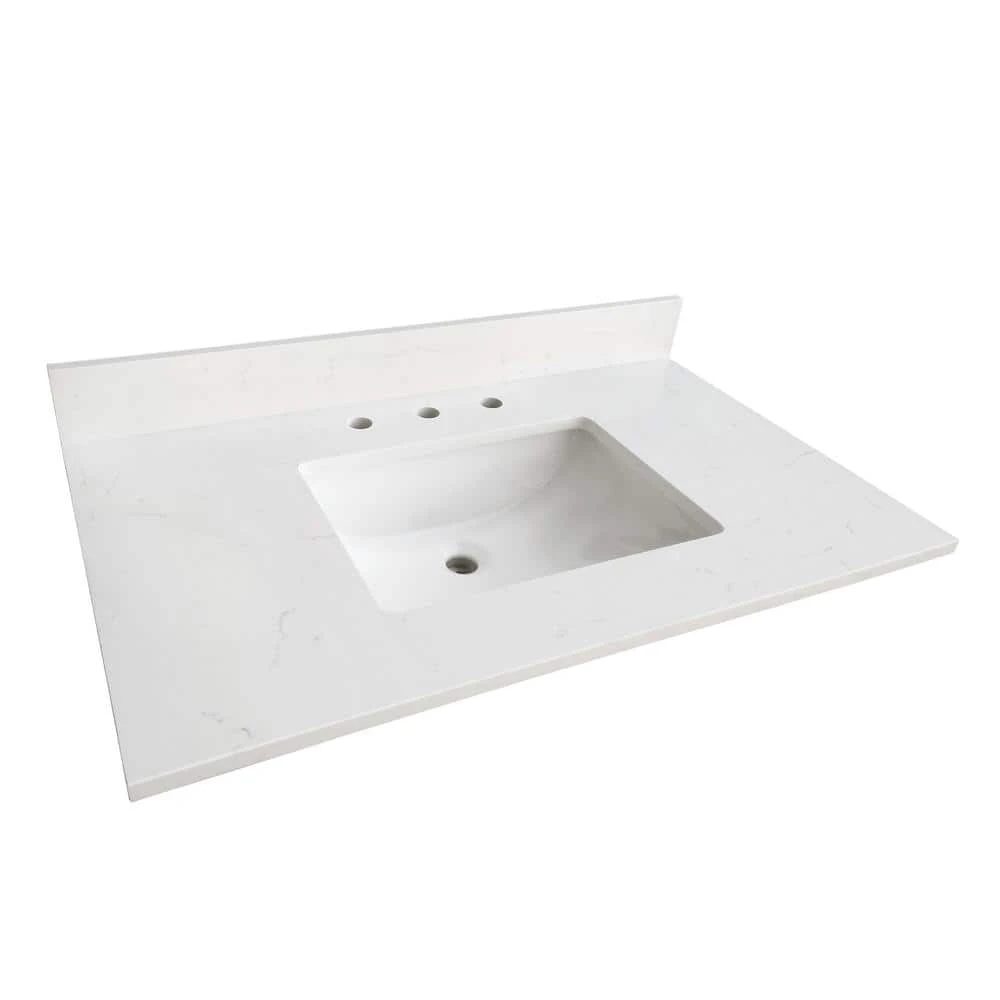 43 in. Carrara White Quartz Top. Attached stylish rectangular white vitreous china undermount bowl with safety overflow hole. 4 in. high backsplash included to help protect walls from water damage.