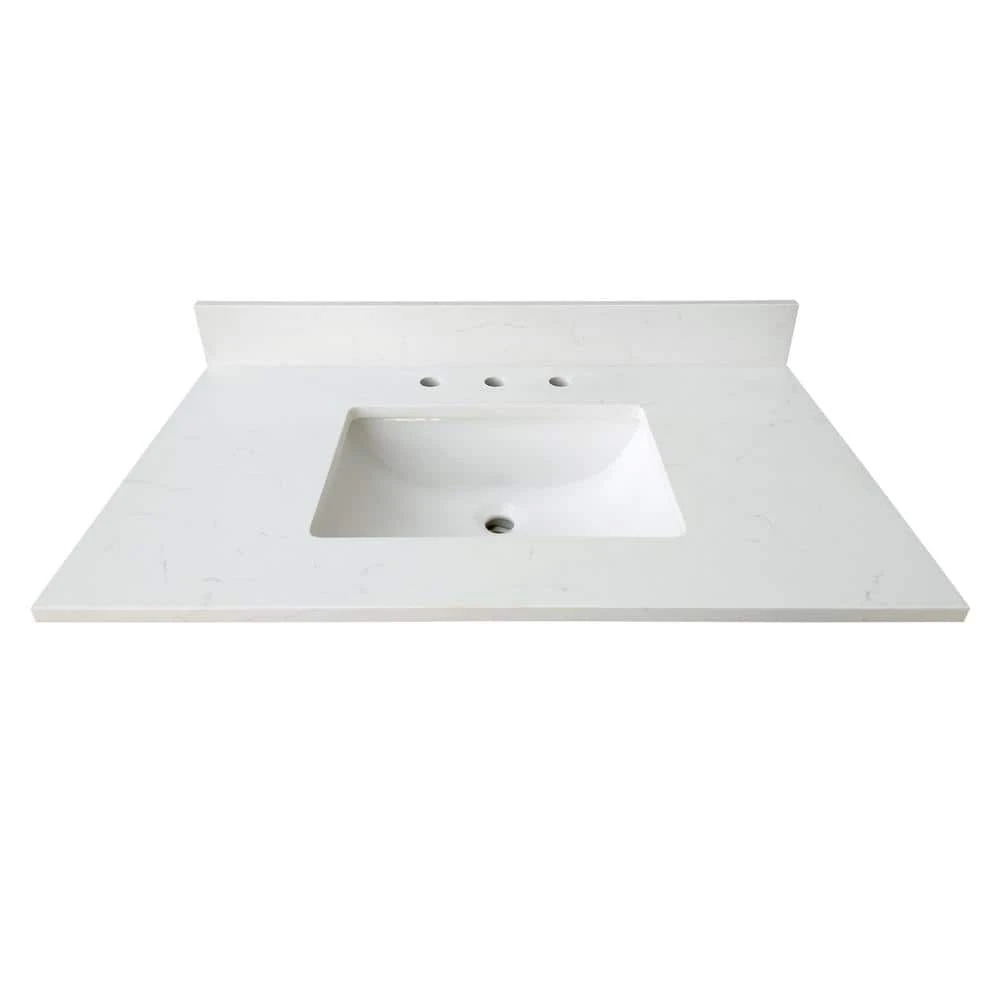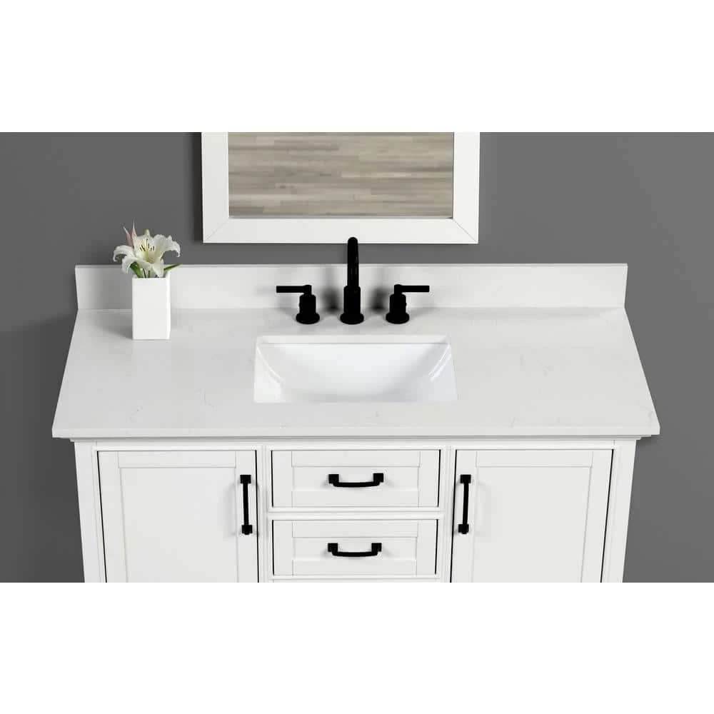 49 in. Carrara White Quartz Top. Attached stylish rectangular white vitreous china undermount bowl with safety overflow hole. 4 in. high backsplash included to help protect walls from water damage.