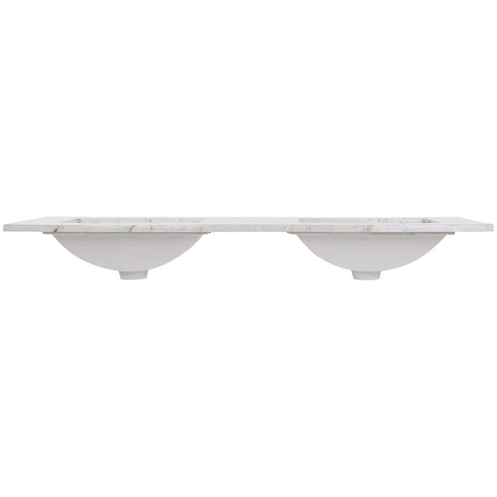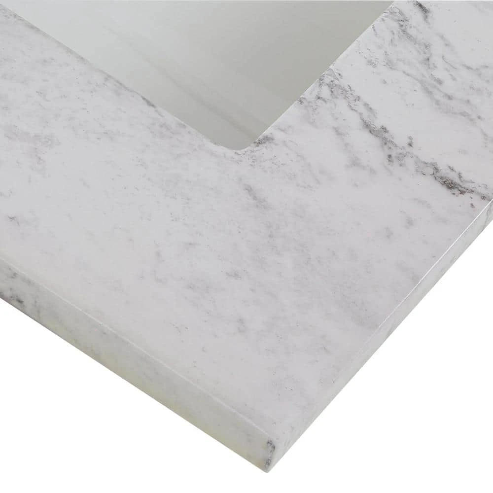 The Home Decorators Collection 61 in. W Stone Effects Vanity Top in Lunar effortlessly unites fashion and beauty with quality material. The Lunar vanity top finish comes with a matching 3.5 in. tall separate backsplash to help protect your walls from splashes and stains and features a white base with soft and striking veining of light gray and black. Durably built with 2 factory assembled white rectangular undermount sinks, the Home Decorators Collection vanity top is elegant, easy to clean, and ready to be installed atop the cabinet of your choice.