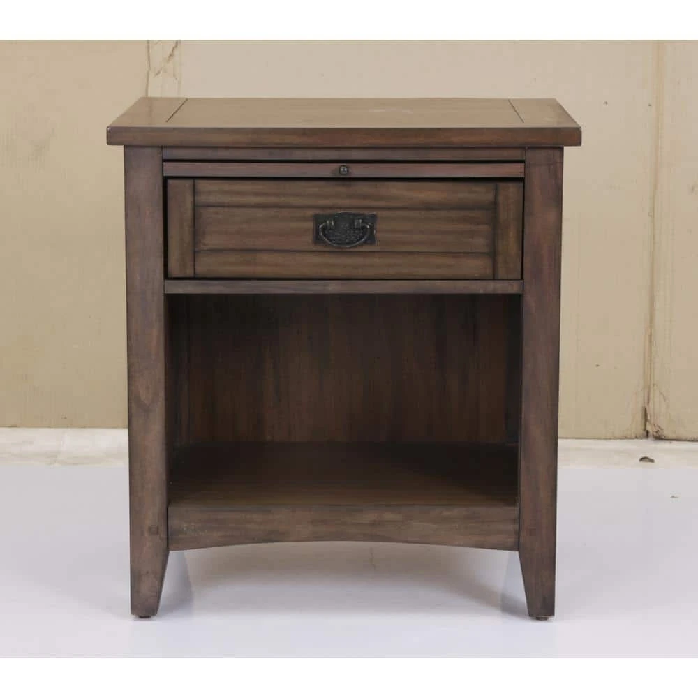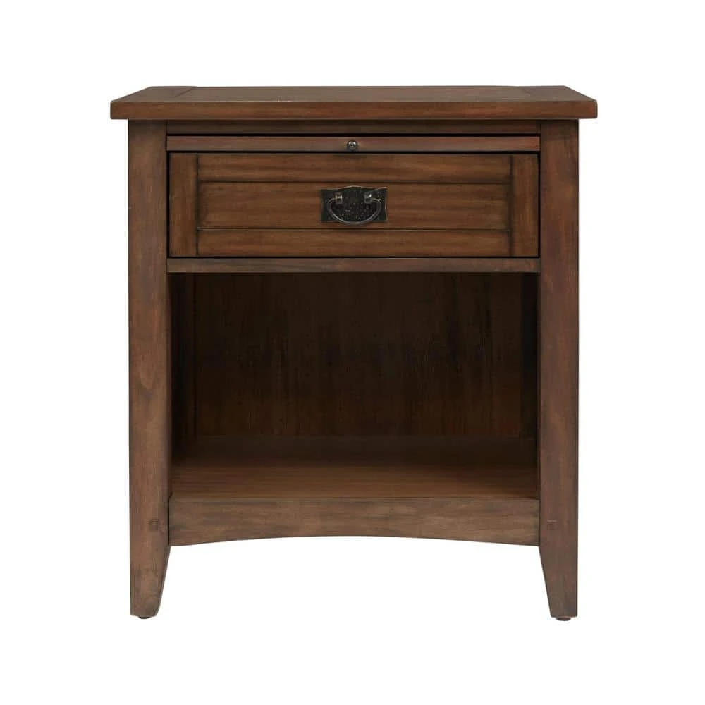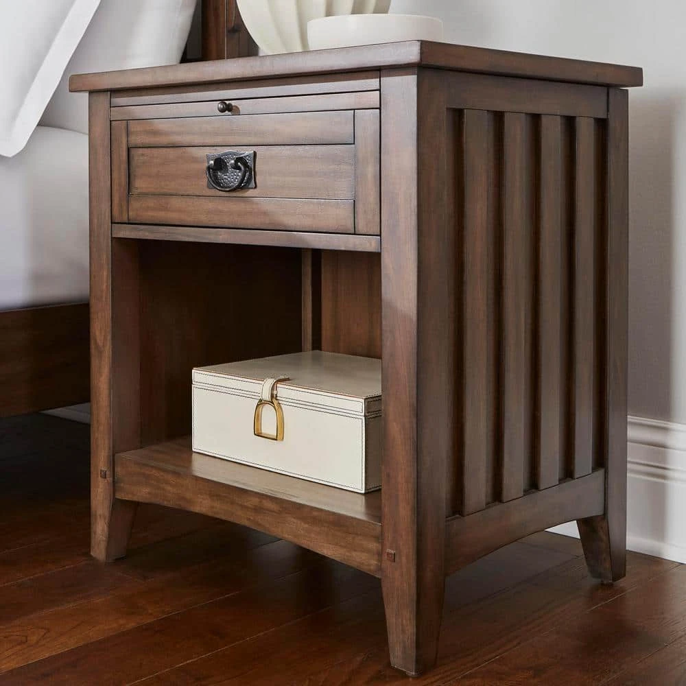 This timeless walnut one drawer nightstand features unique paneling that is sure to stand out in any bedroom. The simple and clean design is ideal for bringing a natural element to your space. The nightstand features one small drawer for organizing bedroom storage and one open shelf for displaying decor. The classic hardware is included.