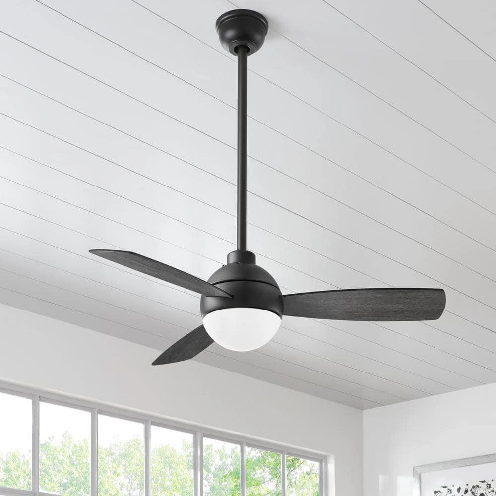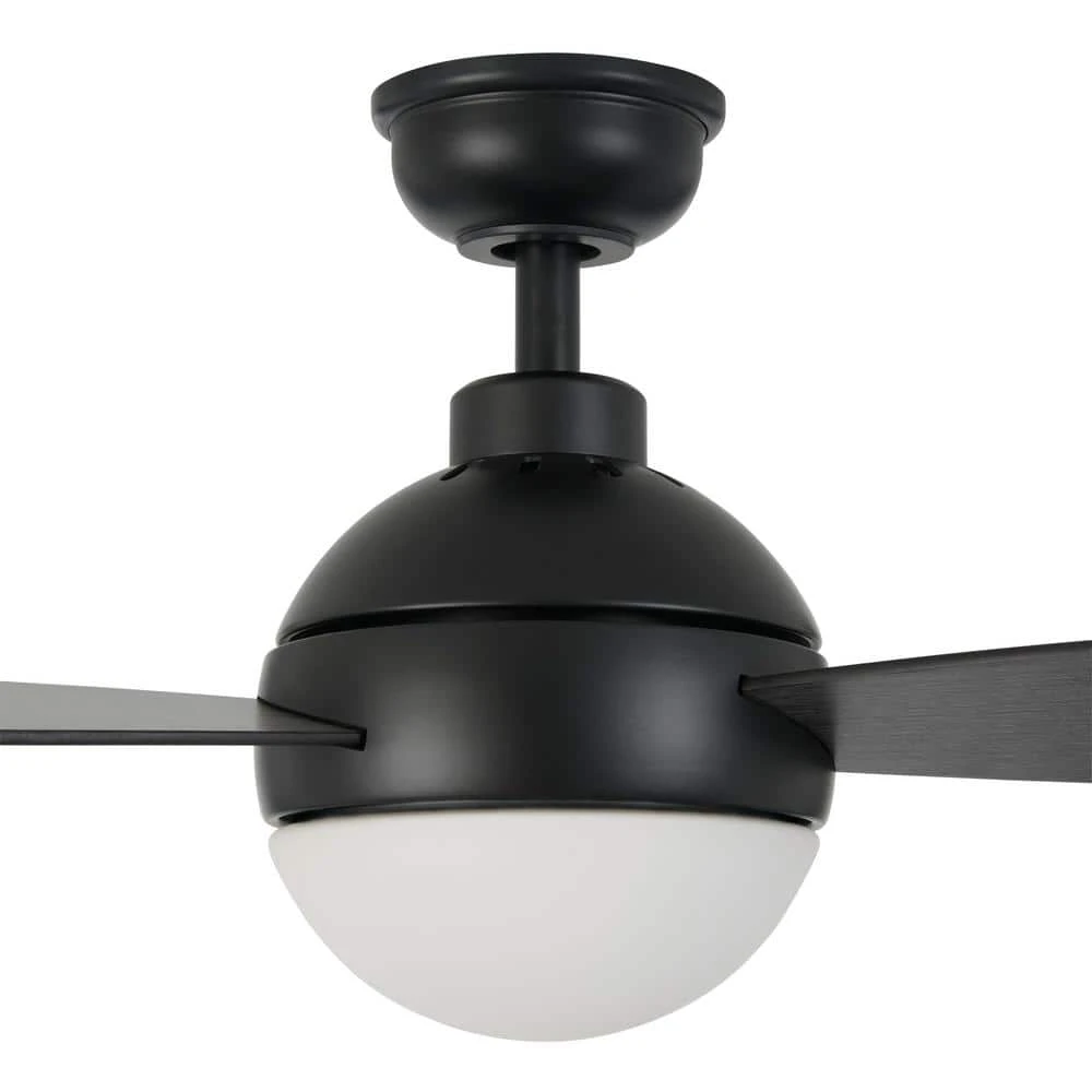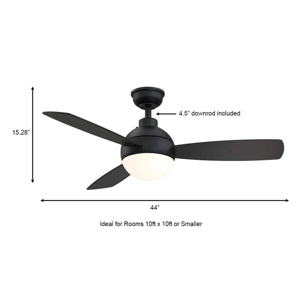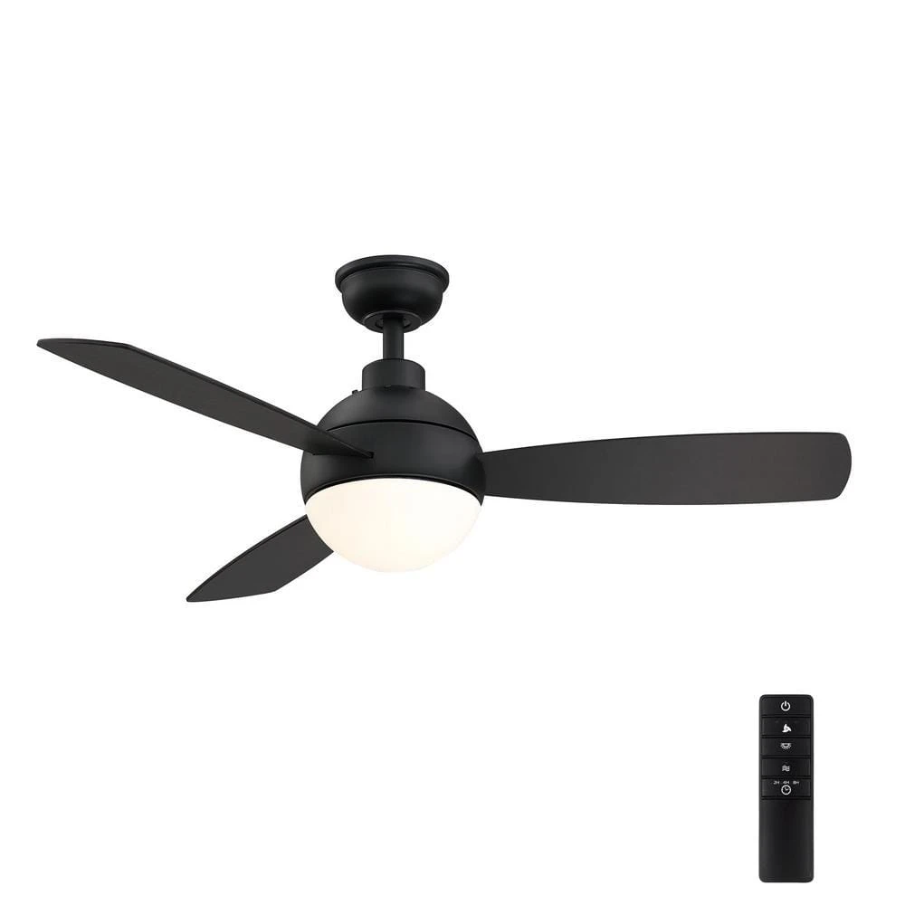 Enhance your home interior with this Home Decorators Collection Alisio 44 in. LED indoor ceiling fan. Designed for 10 ft. x 10 ft. rooms, it offers an integrated Samsung LED light source. For convenience, it includes a handheld remote. Frosted opal glass, a matte black finish and three reversible blades create a charming look.