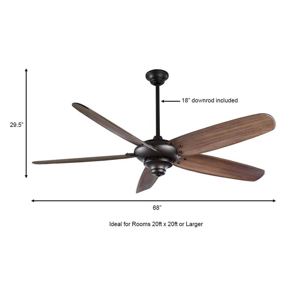 The Home Decorators Collection Altura 68 in. Indoor Bronze Ceiling Fan is beautifully composed of 5 hand-carved wooden blades to complement its versatile finish and contemporary styling. This fan is driven by a powerful motor that delivers 8439 CFM of airflow, making it ideal for great rooms 20 ft. x 20 ft. or larger. It comes supplied with a handy, full-function remote control to toggle its 3 variable speeds, and it even accepts accessory lighting kits for added functionality. A downrod, extra-long lead wires and concealed hardware are included for added value and convenience.