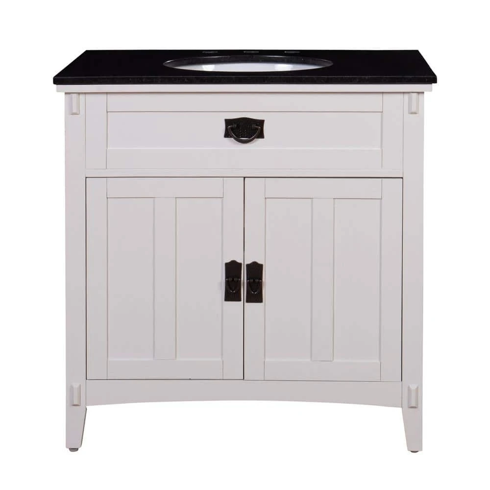 Enliven your space with this Artisan 33 in. W Vanity in White with Marble Vanity Top in Natural Black with White Sink. It comes with a dark oak finish, soft close doors and unique craftsman accents. It features marble swirling on the vanity top in some cases.