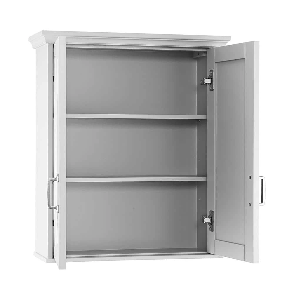 Exquisite design, understated finish and smart storage features make the Ashburn collection by Foremost a true design wonder. The Wall Cabinet in White provides versatile storage space with 2 adjustable shelves offering customizable storage behind 2 doors. Like other Ashburn pieces, this cabinet is accented with intricate top mouldings and satin nickel hardware for a stunning designer touch, complemented by sleek lines for a clean, elegant appearance.