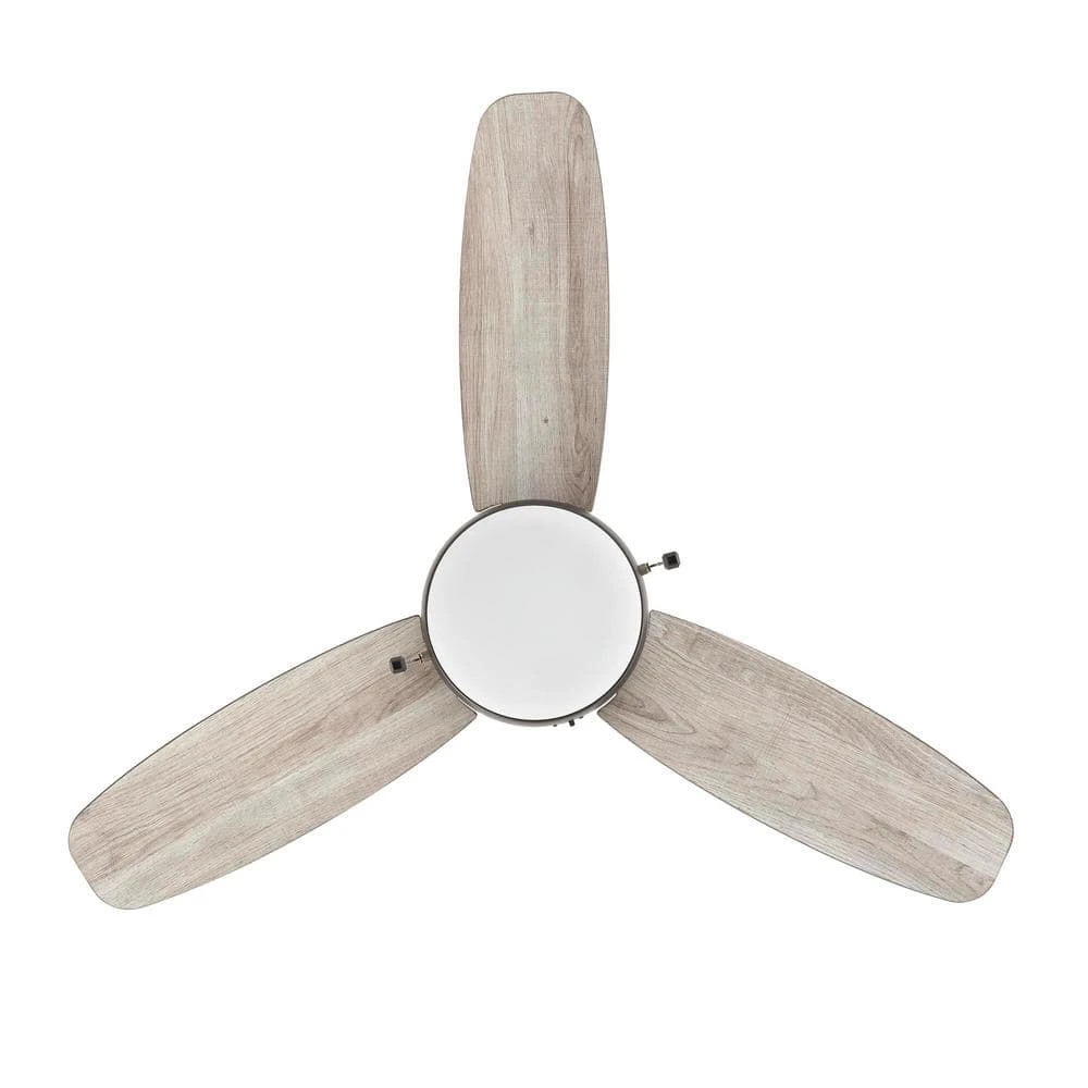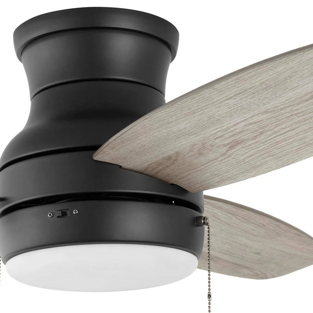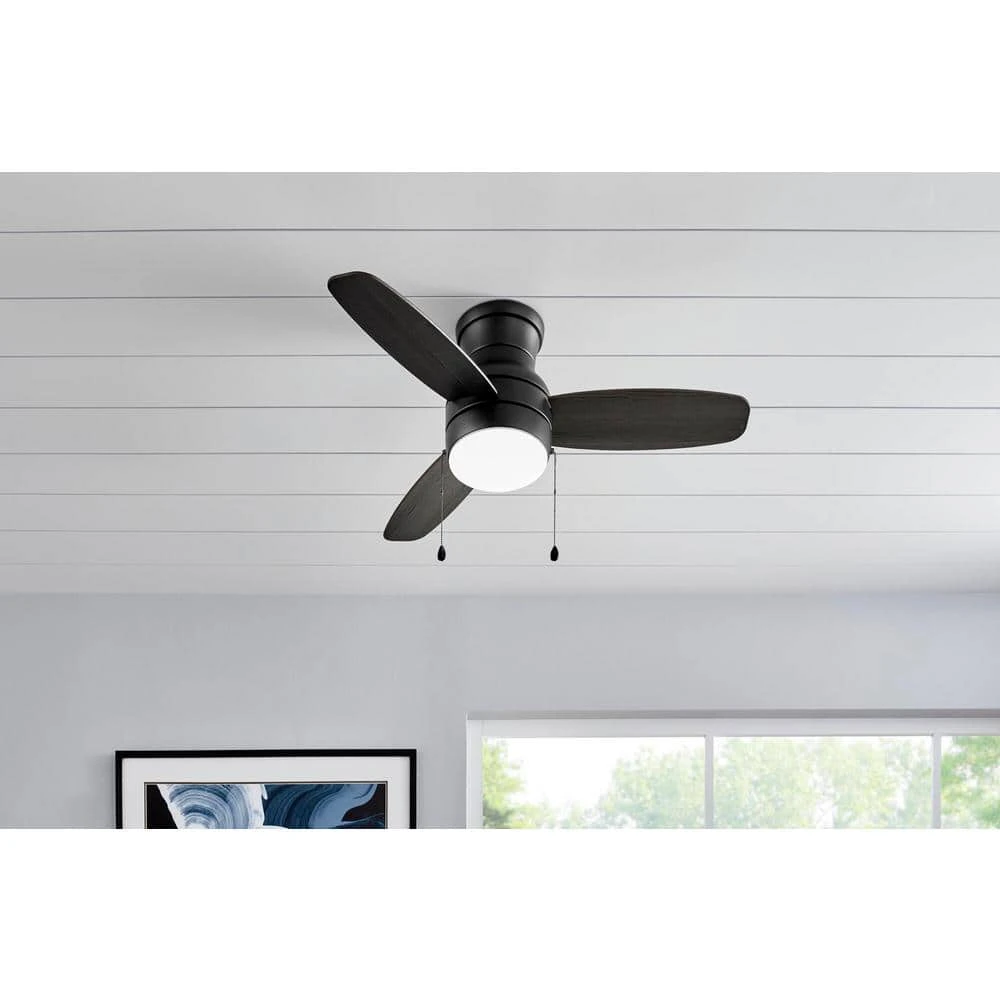 The 44 in. Ashby Park ceiling fan by Home Decorators Collection combines form and function to complement your indoor living spaces. The flush mount design is perfect for rooms with low ceilings and the integrated LED light kit offers versatile lighting options. Choose from 2,700K, 3,000K or 5,000K light output options to suit your lighting needs. The fan’s beautiful matte black finish is paired with 3 reversible blades in gray washed oak and blackened oak finishes to easily blend with today’s decor trends.