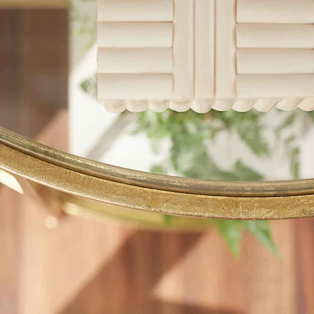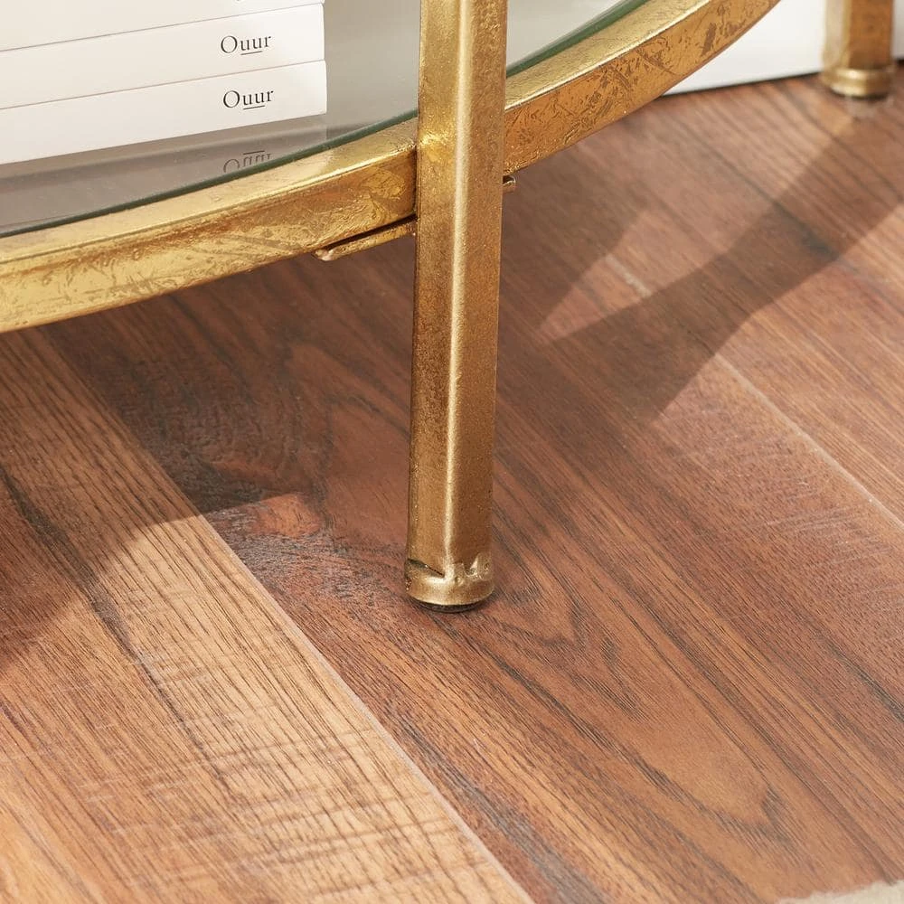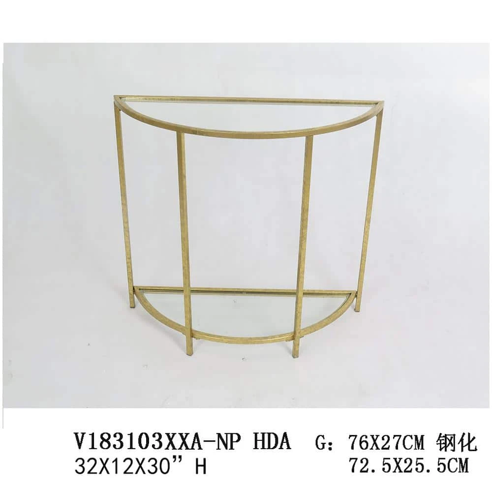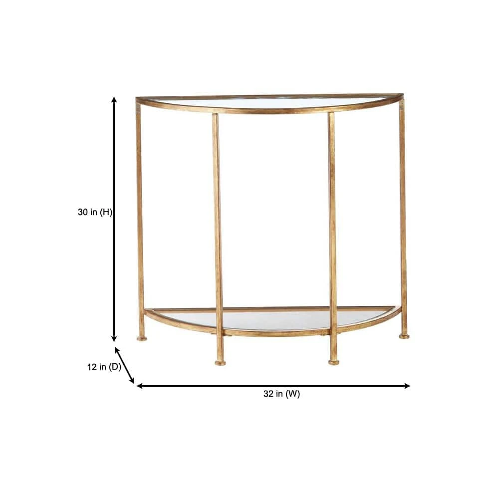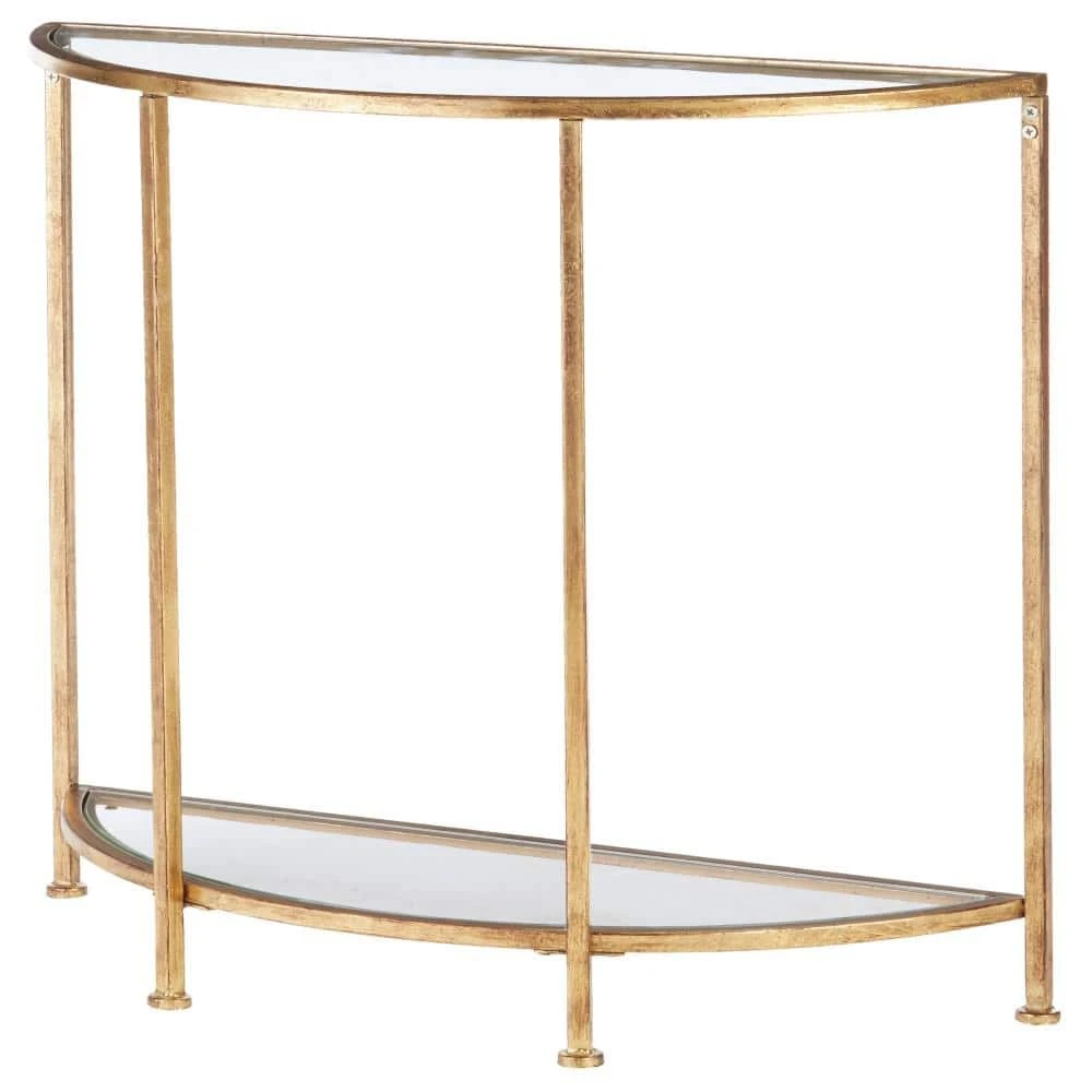 Our Home Decorators Collection Bella demilune console table brings a bit of glam into any room. Geometric lines and curves form the elegant half-moon shape. On the metal frame, a gold leaf finish lightens the entryway, living room or any other place it resides. The tabletop and lower shelf are both clear tempered glass.