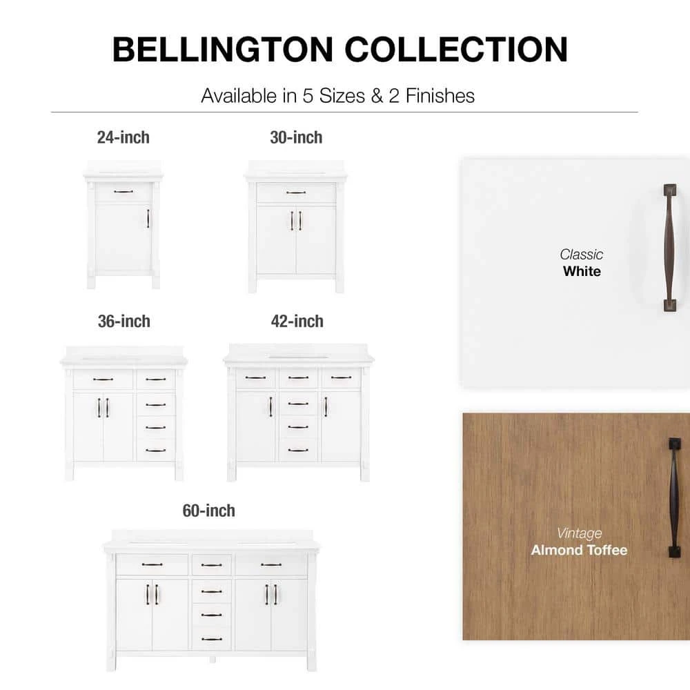 The Bellington vanity takes a farmhouse-inspired silhouette, incorporates pristine accents and antique black finish hardware with a straight edge countertop, and brings it all together with practical storage options to create a true statement piece of beautiful furniture. Its single, central undermount sink has a neat rectangular shape, while the cabinet contains one regular soft-close drawer and one two-door cabinet with internal shelf. It is available in both a white and an almond toffee treated paint finish, as well as in widths of 24 in., 30 in., 36 in., 42 in. and 60 in.