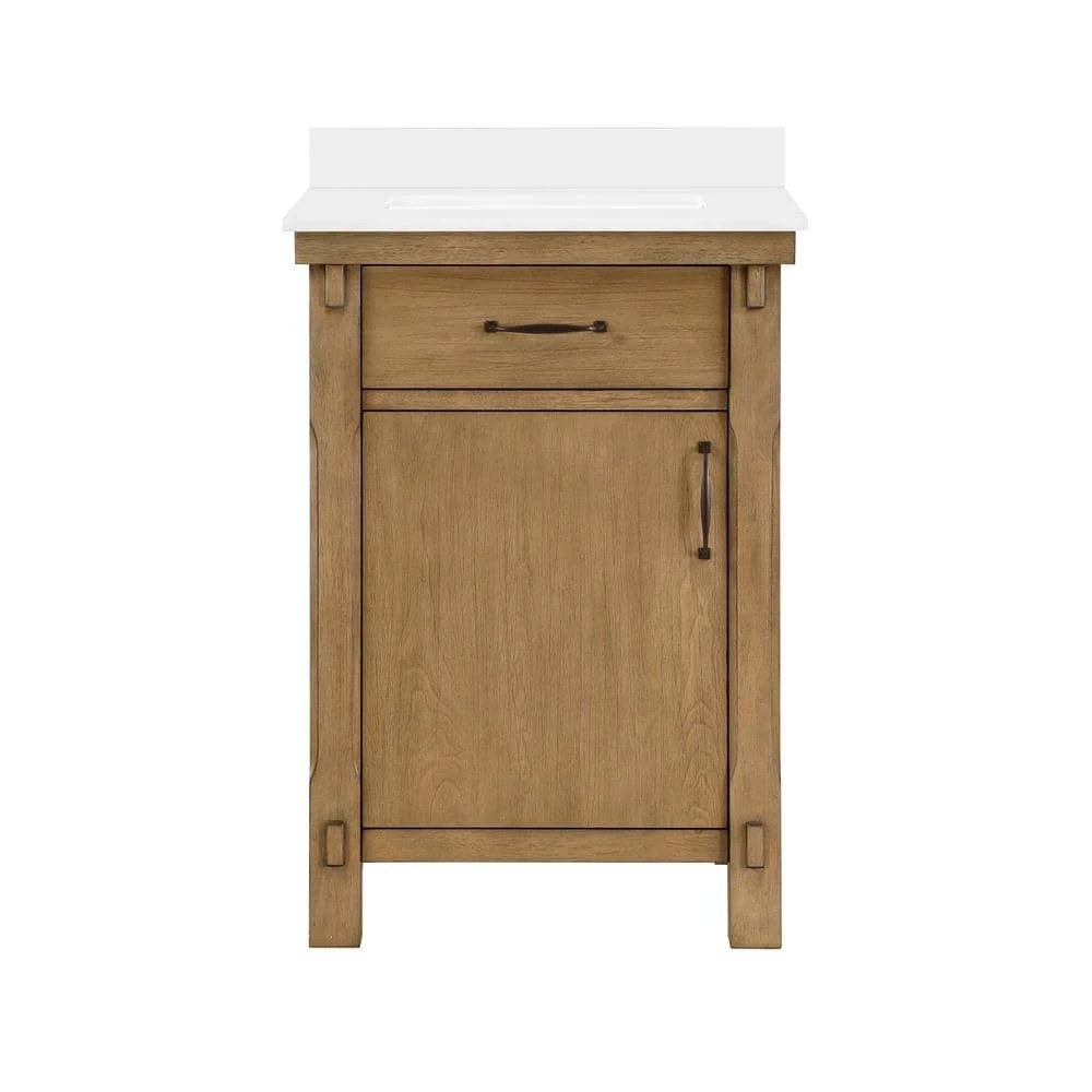 - Almond toffee wood vanity featuring straight 15 mm-thick white engineered stone countertop