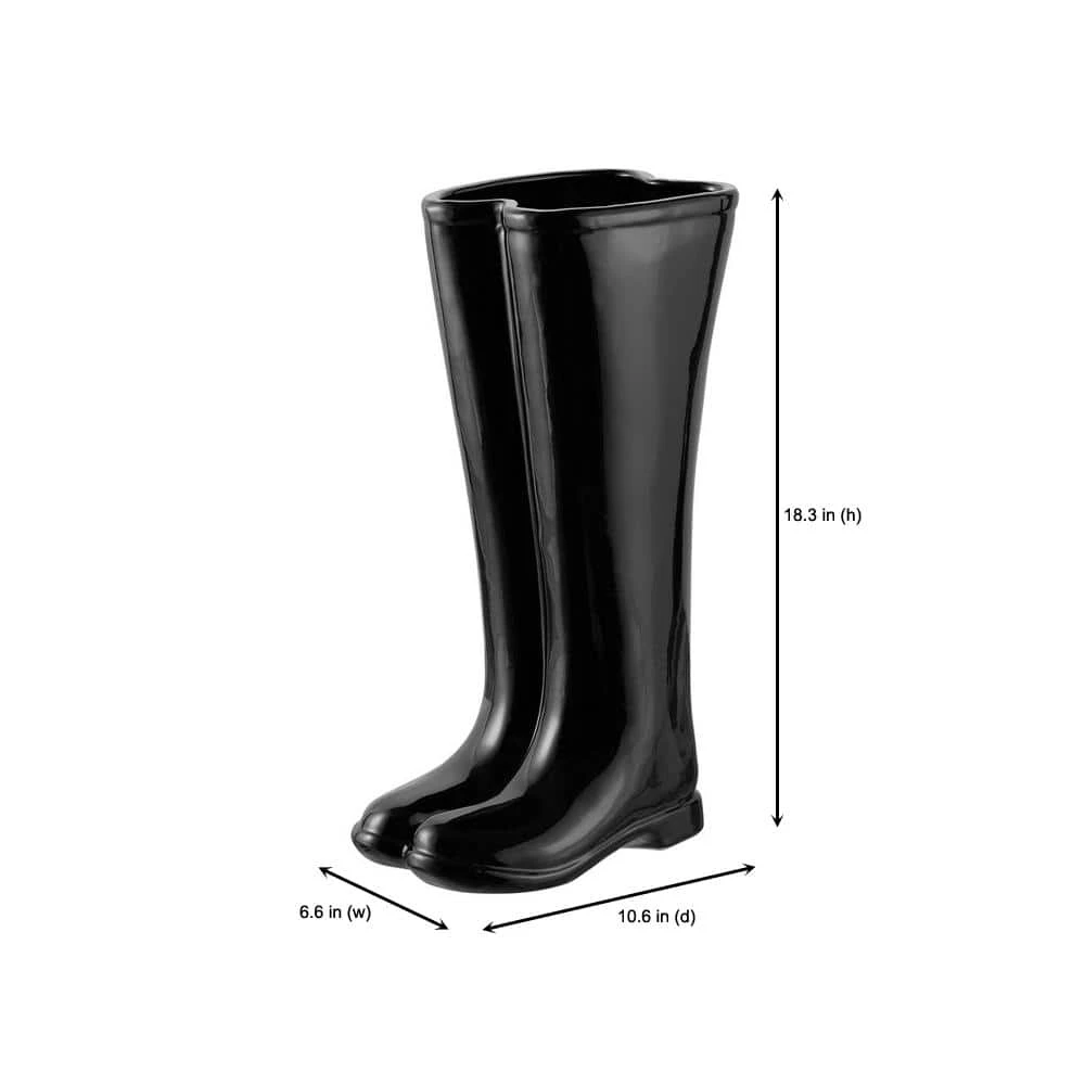 The Black Boots Umbrella Stand from Home Decorators Collection is handcrafted from ceramic that ensures durability and resistance to chips and cracks. The glossy black finish of this stand accentuates the visual appeal of your farmhouse-style decor. Its spacious design allows you to stow up to five large umbrellas. With its unique boot-style design, this umbrella stand also serves as a decorative accessory for your entryway passage. Wipe this stand with a soft, dry cloth to keep it clean.