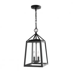 The Blakeley collection from home decorators collection features transitional style outdoor lighting suitable for a wide variety of home styles, from farmhouse to traditional. The Blakeley 2-light hanging pendant offers an adjustable height and a versatile design, perfect for illuminating porch entryways and backyard patios. The candelabra light bulbs are fully visible behind the clear beveled glass sides, allowing for ample light output. The fixtures bottom is open to offer directional lighting as well as easy access to change the bulbs. The Blakeley family is offered in a classic black finish which will coordinate well with many existing decor styles and pieces. Shop the Blakeley Collection for additional light counts and fixture types.