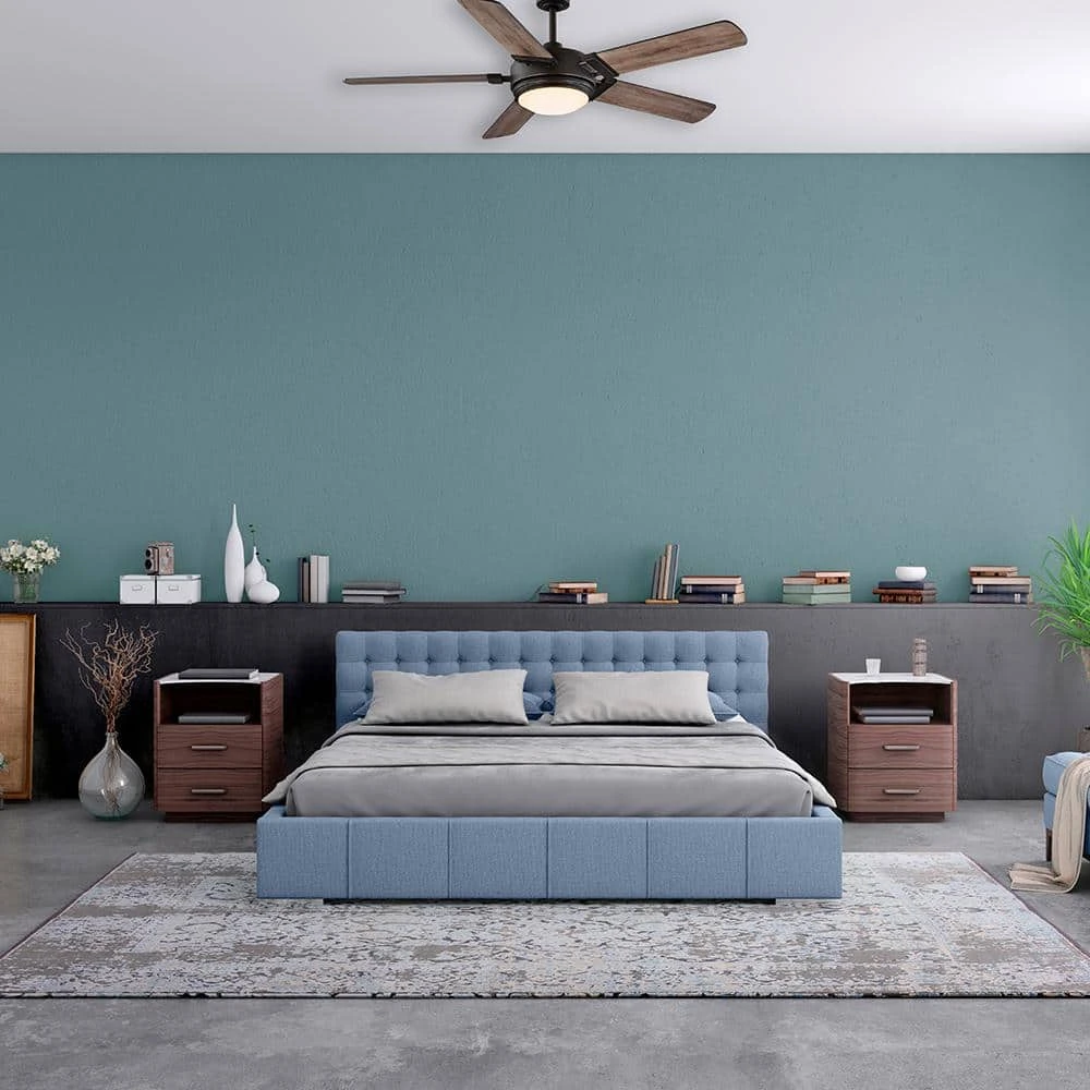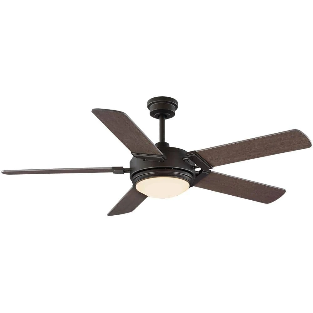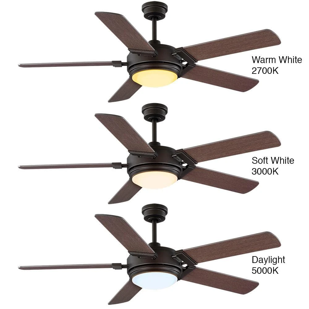 Enhance your outdoor living space with the Home Decorators Collection 60 in. Blakeridge ceiling fan. Perfect for use indoors or covered outdoor locations like porches and patios, this damp rated fan is both beautiful and versatile. The integrated LED light features color changing technology that allows you to choose the lights appearance – warm white, soft white, or daylight. The powerful and quiet 3-speed reversible motor is easily controlled via the convenient hand-held remote control. Installation is a breeze with included features like a slide-on mounting bracket and twist lock glass shade. The rich, bronze finish is complemented by 5 reversible blades in dark oak and ash finishes.