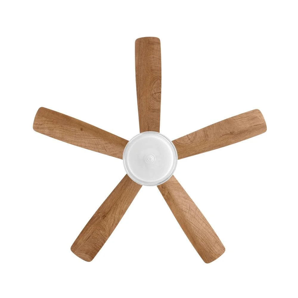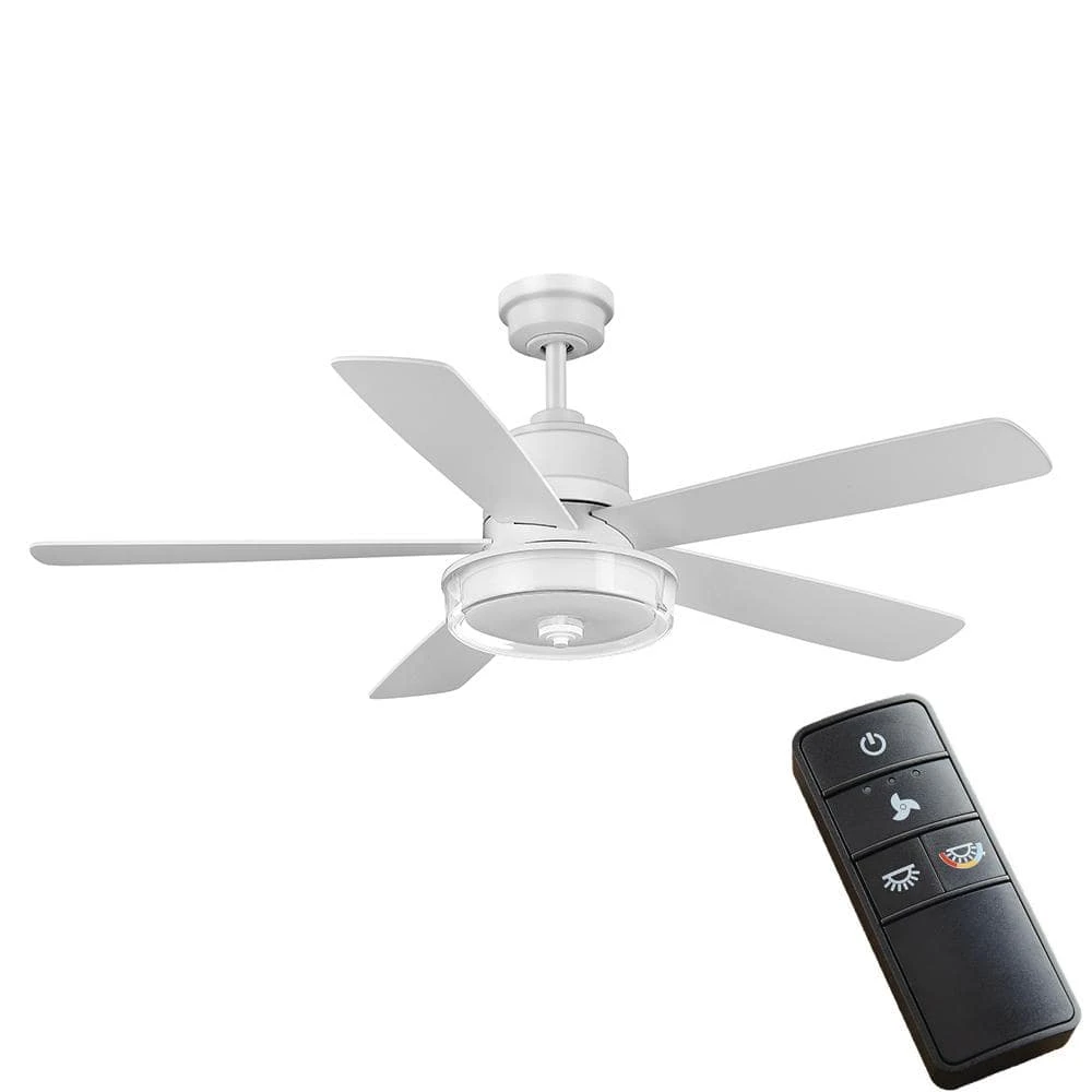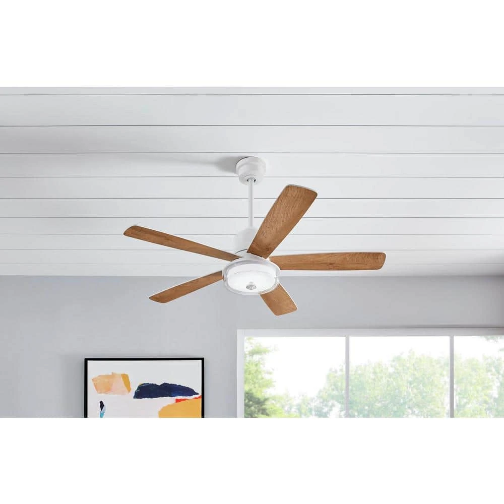 The Home Decorators Collection 52 in Castleford fan offers an easy way to enhance your indoor living spaces. This transitional ceiling fan offers powerful and quiet performance for year-round comfort. The matte white finish is paired with 5 reversible blades in Cameron oak and matte white finish to easily blend with your decor. The Castleford includes an integrated and dimmable LED module light kit that allows you to choose from 6 different color temperature settings ranging from warm white (2700K) to daylight deluxe (6500K) to match your home’s current lighting. Control is at your fingertips with the included handheld remote to operate the fan’s 3-speeds and light. A wall cradle is included to store the remote when not in use.