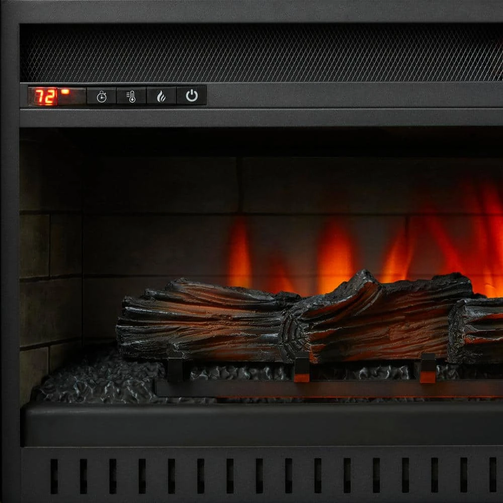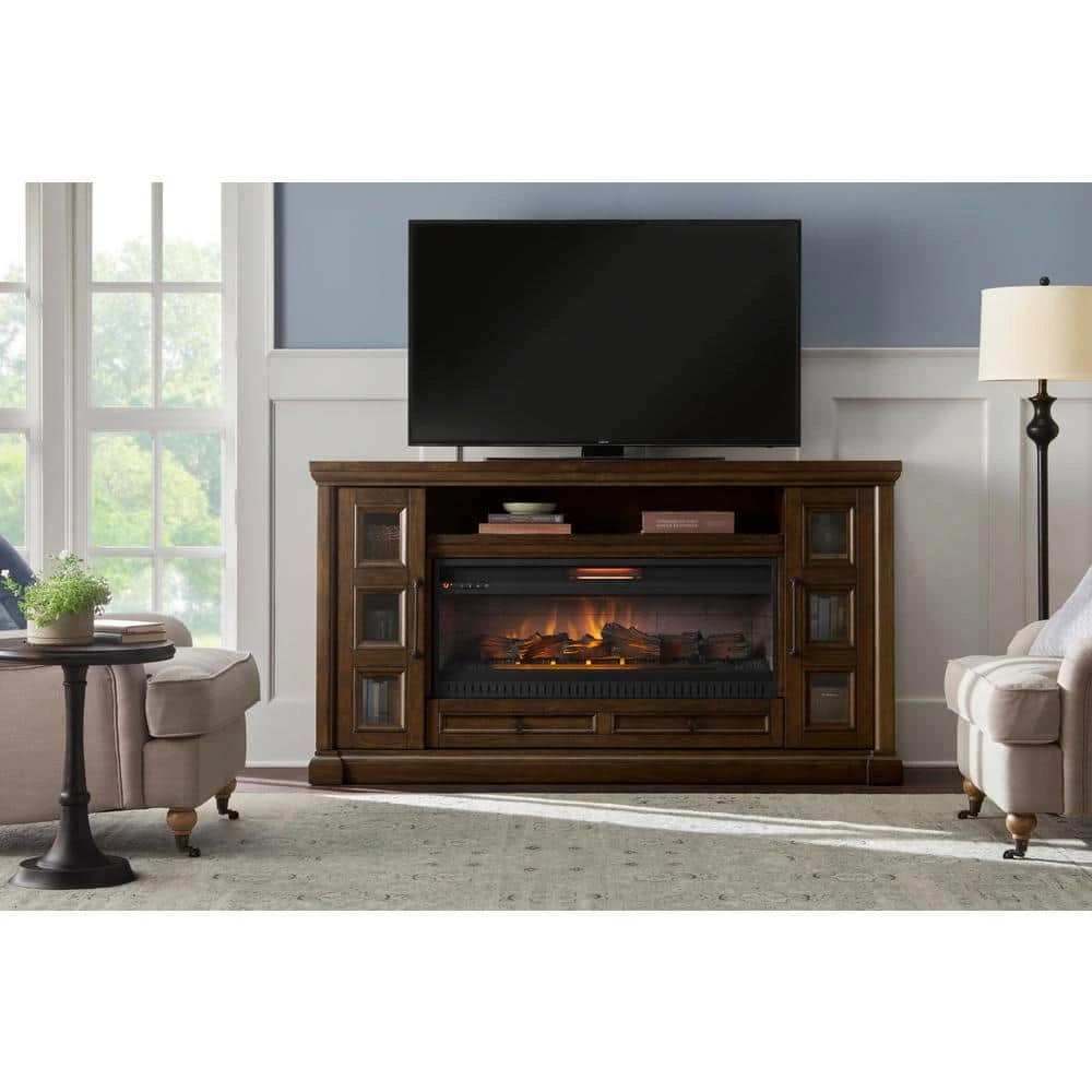 The 72 in. Electric Fireplace will transform your living room or family room into a warm, comfortable and stately showplace. The quality construction of hardwoods and laminates are made even more impressive by the craftsmanship of the Rich Brown Cherry finish. Enjoy family gatherings, game day parties and date nights in front of a cozy fire. The Console offers realistic log and flames with energy efficient LED technology and 4 flame heights. Enjoy cozy fires year round with or without heat. With its 5,200 BTU infrared heater, the electric fireplace can warm even the largest rooms. Control the temperature range, 62°F to 82°F and flame display with the handy remote control. The fireplace console can accommodate flat panel TVs and includes cabinets for storing media and gaming accessories. Now any room can be a cozy haven with the Fireplace Console. For flat panel TVs (not for use with CRT TVs) Sturdy hardwood construction Durable Rich Brown Cherry finish Cabinets store your media and gaming accessories Console requires assembly 42 in. Infrared electric fireplace insert 1,500-Watt/5,200 BTUs of infrared heat Realistic logs and embers Temperature range control: 62°F to 82°F Easy set up plugs into standard 120-Volt/60 Hz electrical outlet.