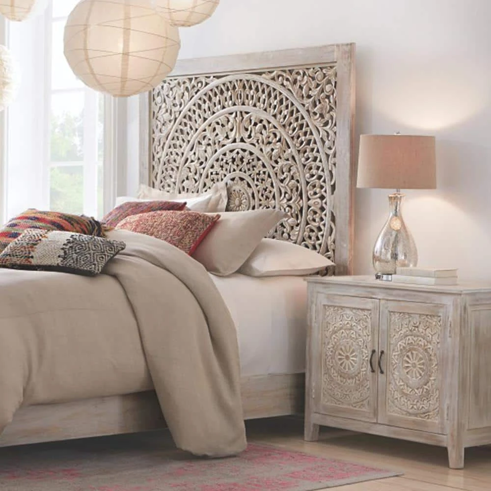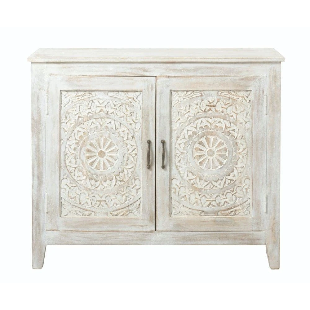 With an intricate medallion design carved into each door, our Chennai Nightstand is the perfect accessory for your bedroom. Mango wood in a whitewash finish gives this bedside table world-beat appeal. Try complementing it with vintage or cottage decor in muted colors. This wooden nightstand is roomy as well as stylish. Thanks to the removable interior shelf, you can fit anything inside, from books and remotes to your computer and nighttime slippers.