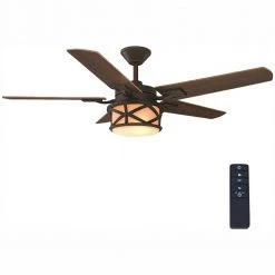 Choose this Home Decorators Collection 52 in. Copley ceiling fan for a rustic style designed to enhance your indoor or outdoor setting. This damp rated fan features a decorative cage light kit complemented by matching flywheel blade arms. The light kit includes two 9-Watt LED bulbs, which increase energy efficiency and last longer than standard bulbs. This fan’s five reversible blades offer style versatility to match modern home decor styles, and it includes a feature-rich remote to conveniently control the fan’s trio of speeds and light as well as a fan/light timer and Comfort Breeze setting which randomly sets your fan’s speed to create an organic breeze effect. Mount this fan on a flat or angled ceiling.