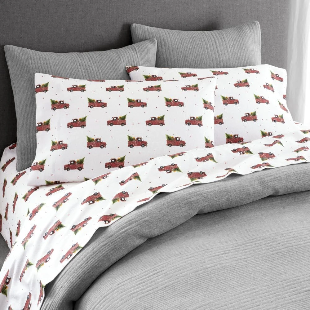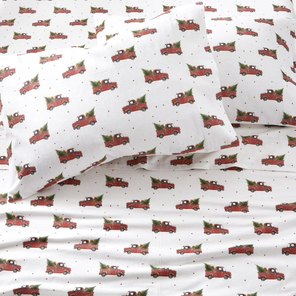 - Fun and festive, holiday-themed red vintage woody truck flannel sheets