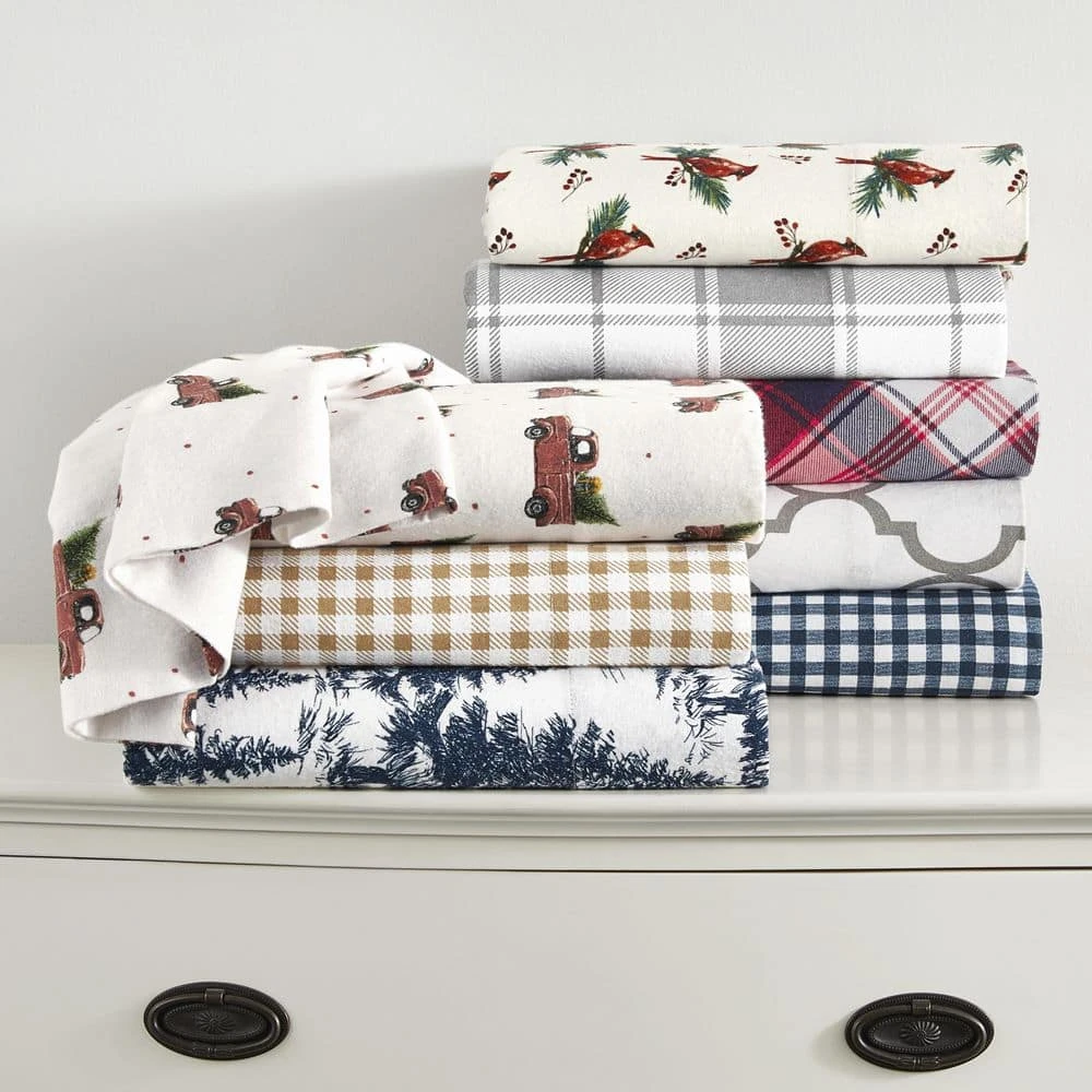 Enjoy the perfect balance of warmth and comfort with our Home Decorators Collection Cozy Cotton Flannel Sheets. Brushed on both sides, these flannel sheets have all around warmth to create the coziest of sleep experiences once the temperature drops. They also feature a lightweight plain weave construction for increased breathability, ensuring you won’t overheat. These flannel sheets come in a variety of fun and festive holiday-themed prints and colors, making it easy to decorate your home for the season. These flannel sheets can accommodate mattresses up to 16 inches deep. You can be confident in your purchase as these sheet sets are certified STANDARD 100 by OEKO-TEX, meaning they have been independently tested in. for harmful substances according to strict scientific criteria that go beyond global legal regulations.