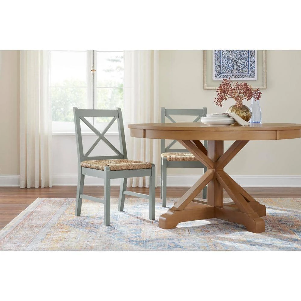 The Home Decorators Collection Dorsey dining chairs are a classic in the making. Modeled on a century-old farmhouse chair, ours have high X-backs and comfortable woven rush seats. The soft green hue refreshes any dining room space in an instant.