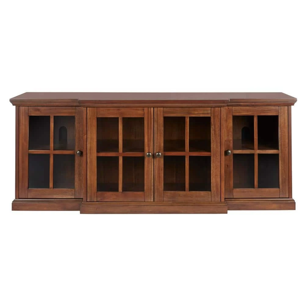 The timeless look of our Home Decorators Collection Edenridge TV stand brings classic charm home. The rectangular media cabinet’s four glass-paneled doors and light walnut finish add brightness to a space. Measuring over 5 ft. wide, the living room cabinet easily accommodates larger TVs. Three interior shelves stow audio and video components, and stacks of books.