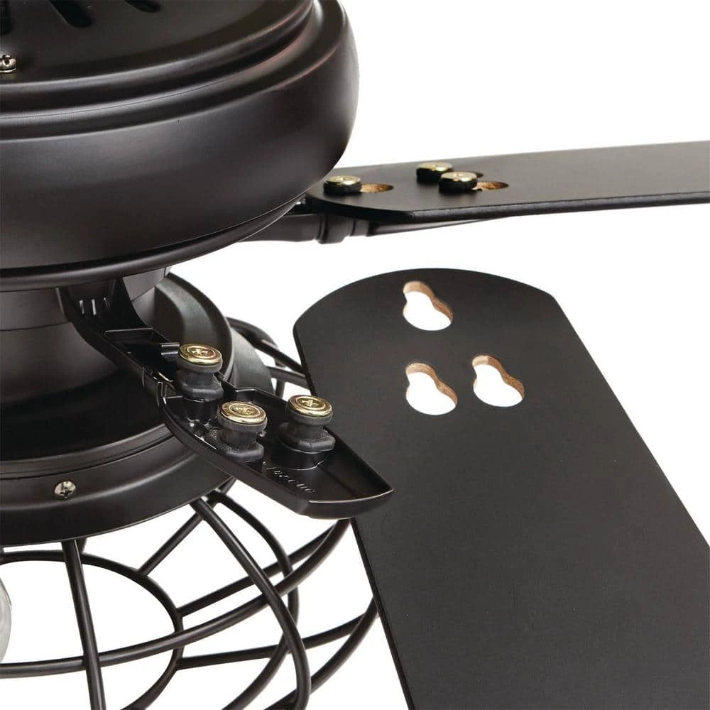 The Home Decorators Collection Ellard 52 in. Matte Black Ceiling fan has a unique cage light kit and included 7-Watt Edison style LED bulbs for energy efficiency. Also, can be installed with either seasoned wood or black blades to coordinate with your furniture or floors. The quick install blade system allows for faster installation.