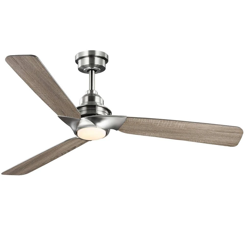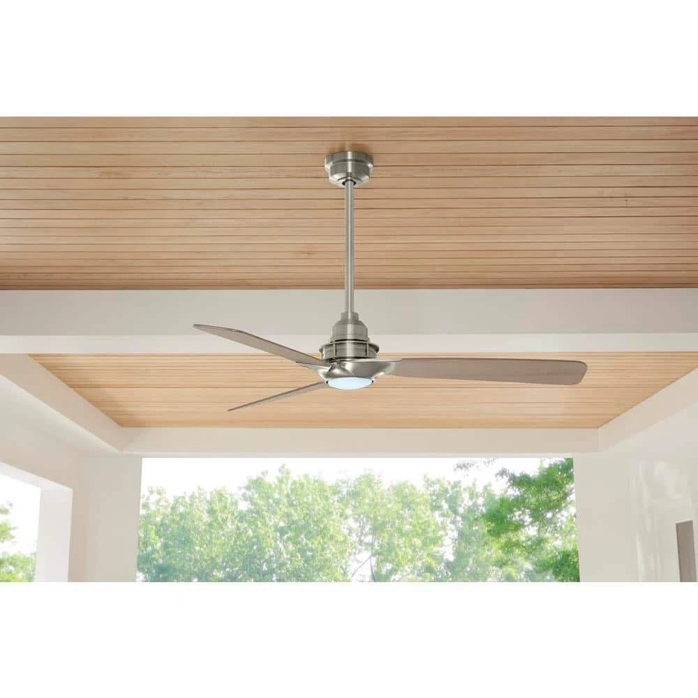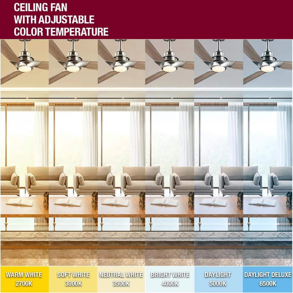 Modern styling and technology are combined to produce the stunning 54 in. Ester ceiling fan from Home Decorators Collection. The Ester fan has a sleek brushed nickel finish paired with 3 vintage aged pewter finish blades and complemented by frosted white shatter resistant plastic light shade. The integrated 21-Watt LED light kit is dimmable and allows you to choose from 6 different color temperature settings ranging from warm white (2700K) to Daylight Deluxe (6500K). Convenient operation is at your finger tips with the included remote to control the fan’s 3-speeds and light. This fan looks great in large room indoor settings and is damp rated for use in covered outdoor spaces like porches and patios.