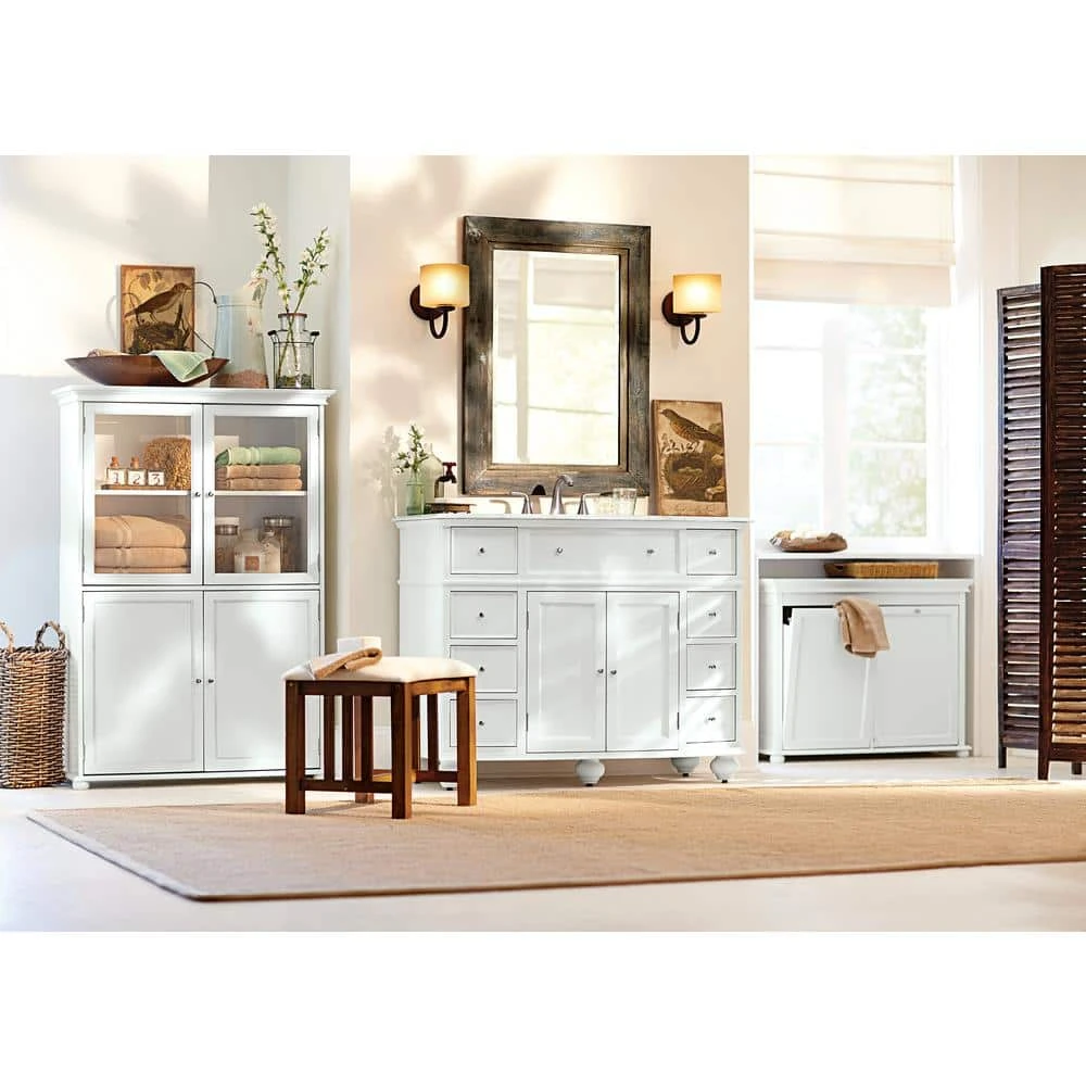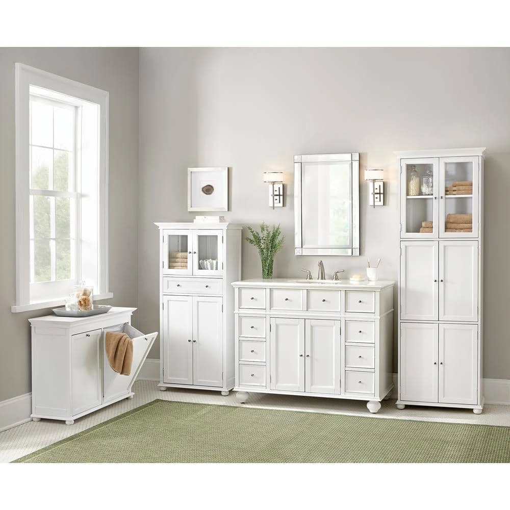 The tilt-out design of the Hampton Harbor Double Hamper allows you to conveniently sort and store your laundry in style. This traditionally designed laundry hamper is durably constructed to withstand heavy use. Its timeless crown molding, recessed panels and bun feet complement a variety of decorating styles, while its lovely white finish brightens your bath. You might also try it in the kitchen to sort recyclables.