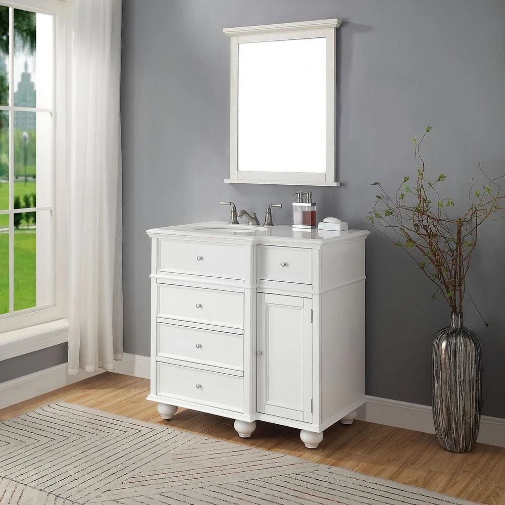 The unique design of the Hampton Harbor 36 in. Bath Vanity from Home Decorators Collection offers plenty of organized storage in a modest space. Three generous drawers lie below the sink cabinet; a smaller drawer sits above a single-door cabinet to the right. The smooth lines and elegant molding of this bathroom cabinet with drawers are set off by tapered ball feet. Finished in fresh, bright white, this vanity brings an airy feel to your bathroom. The real marble vanity top may exhibit swirling or veining; these features are part of the natural beauty of stone and have no effect on function or durability.