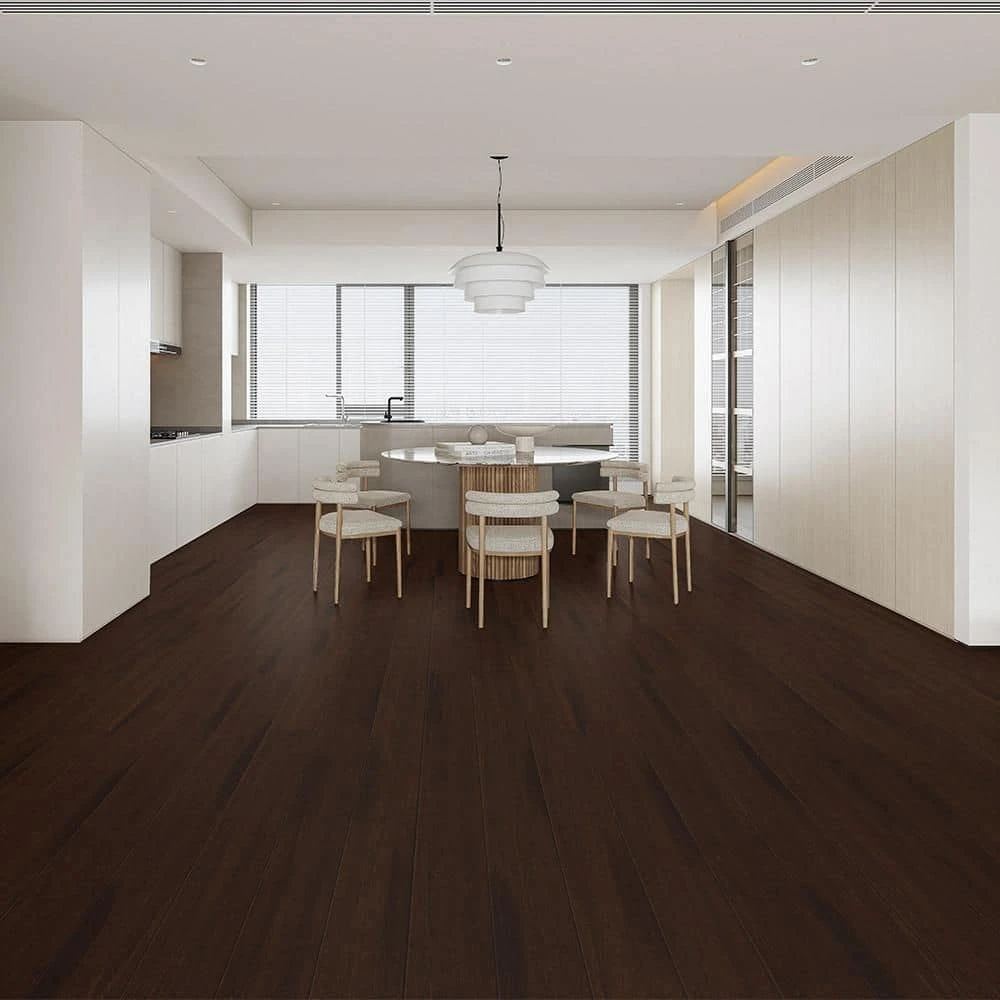 - Prefinished Brown Medium Color, Low Gloss, Hand Scraped Finish