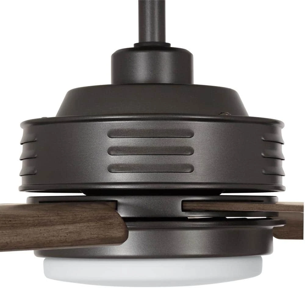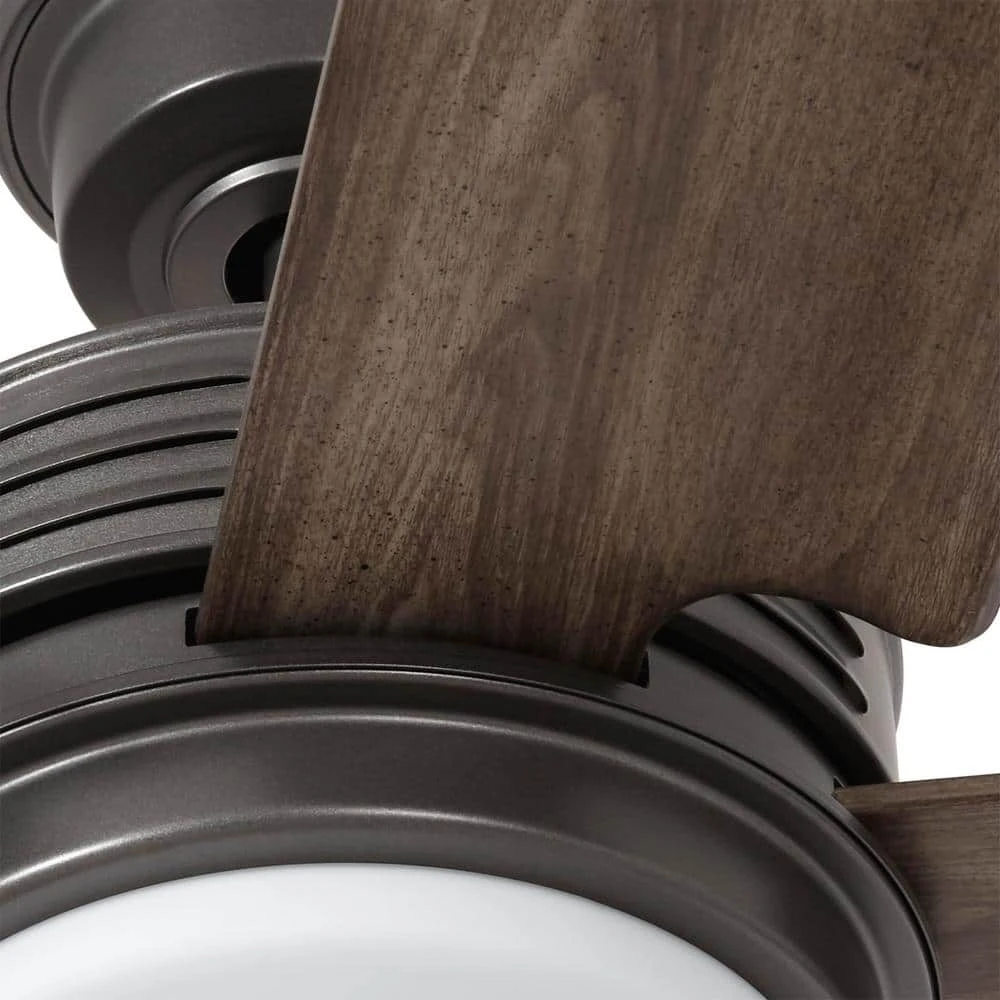 Make a room cooler with this Hansfield 56-in. ceiling fan. Great for large spaces, it comes with a DC motor and a 9-speed remote control for quiet operation and maximum airflow. Seasoned wood plastic blades create visual interest, and the natural iron coating completes the charming look. For lighting convenience, this wet-rated fan includes a 14-watt integrated Samsung LED module and a dome-style frosted glass shade.