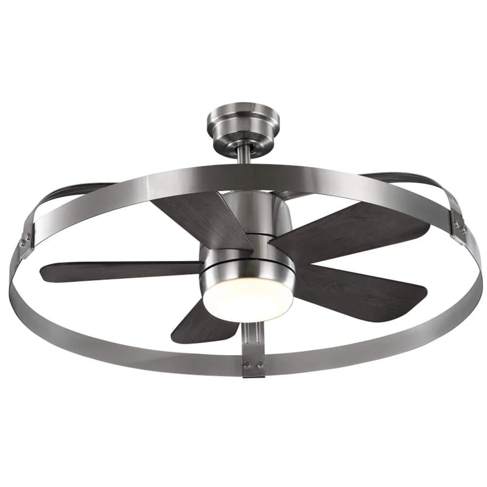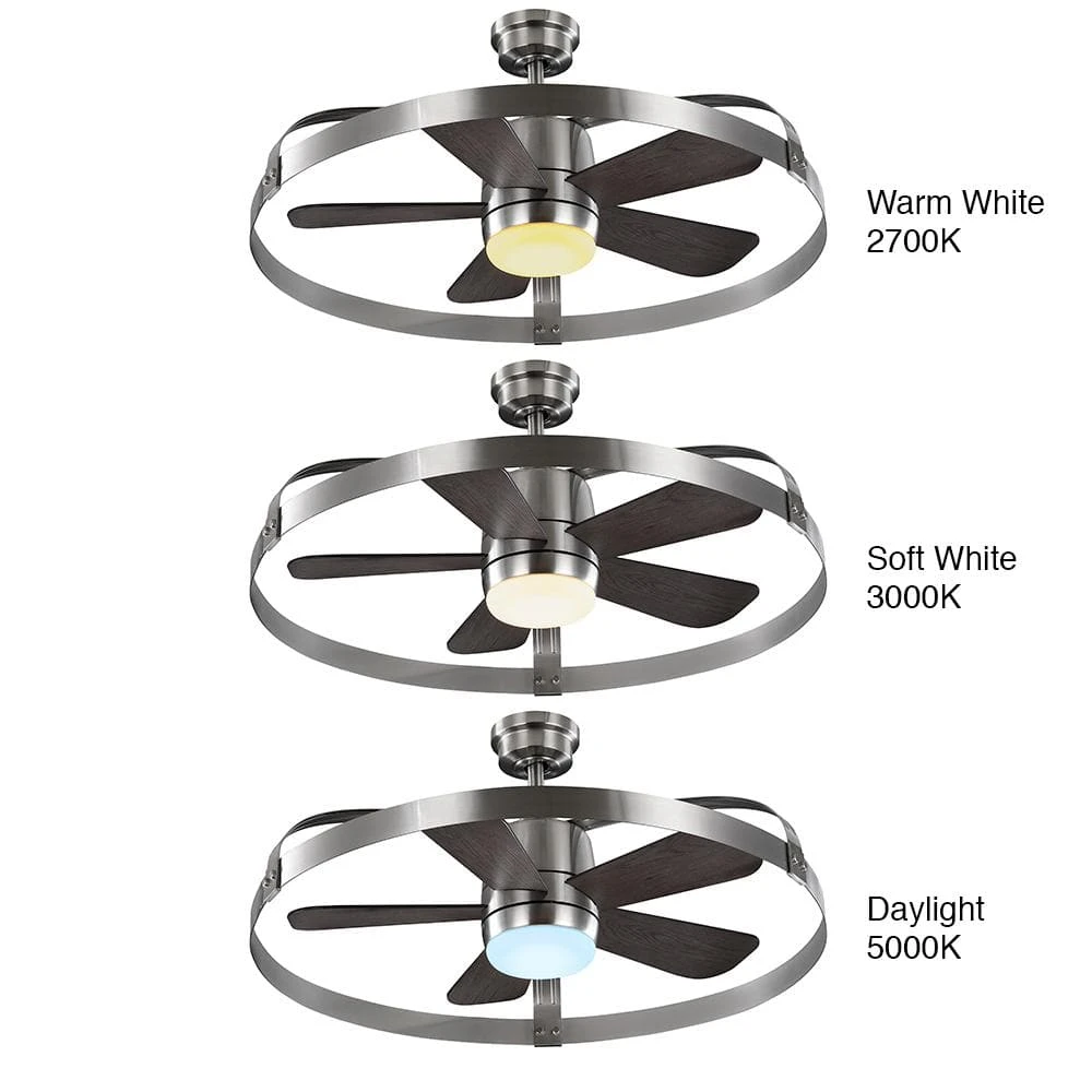 Make a room cooler with this Harrington 36-in. LED ceiling fan. Damp-rated for covered outdoor installation, it offers a dimmable integrated LED module light kit. A 3-speed reversible motor allows maximum airflow. To make installation easy, it comes with a slide-on mounting bracket. A brushed nickel finish and reversible espresso/dark wash oak blades create a modern look.