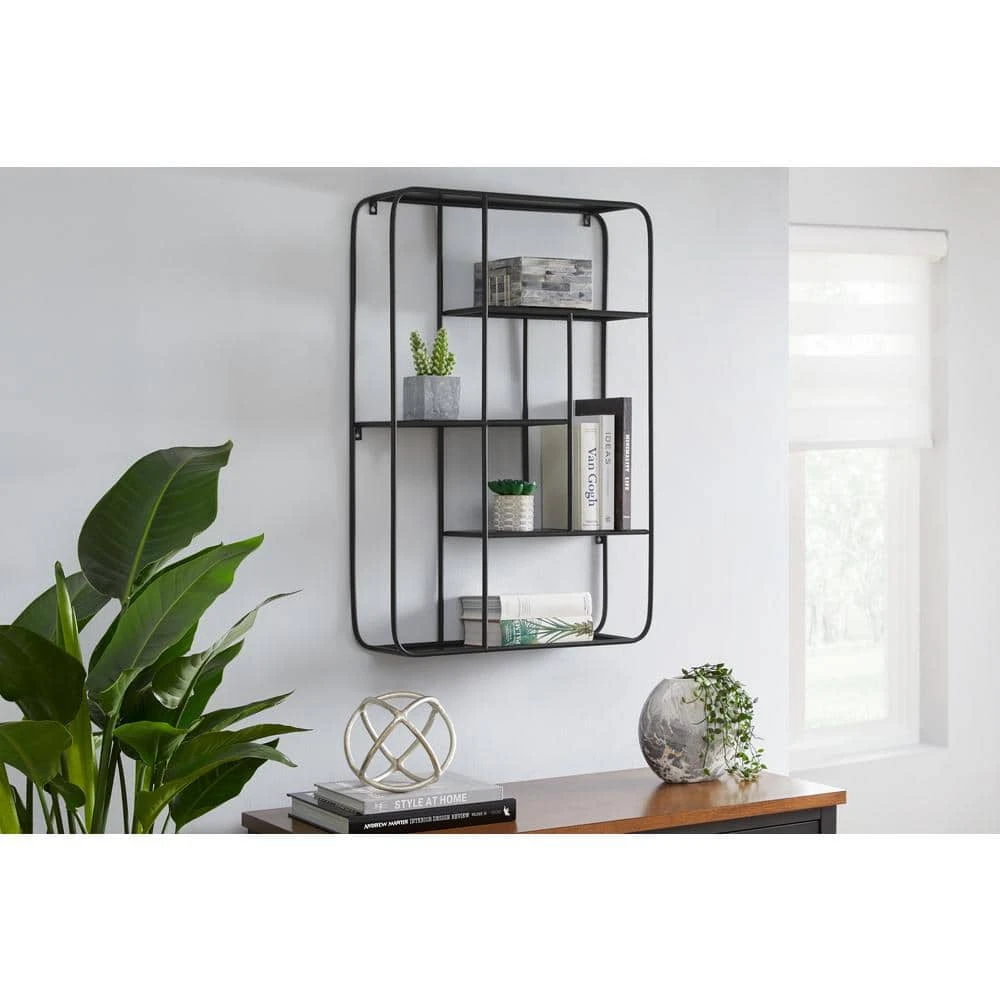 Enhance the utility and aesthetics of your wall with this Home Decorators Collection Industrial Black Metal Wall Shelf. The sleek lines and black metal framework deliver industrial-style appeal, transforming the look and feel of your room. Multiple open cubbies each offer a 10-pound weight capacity, letting you display and organize an assortment of memorabilia, photos and small art objects. This Home Decorators Collection black metal wall shelf features a lightweight yet sturdy iron construction for durability and fuss-free wall mounting.