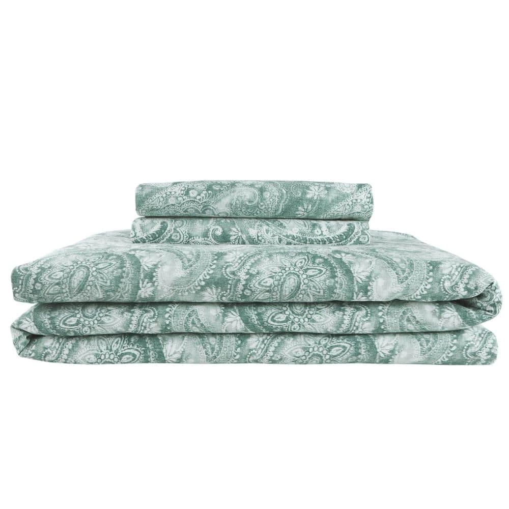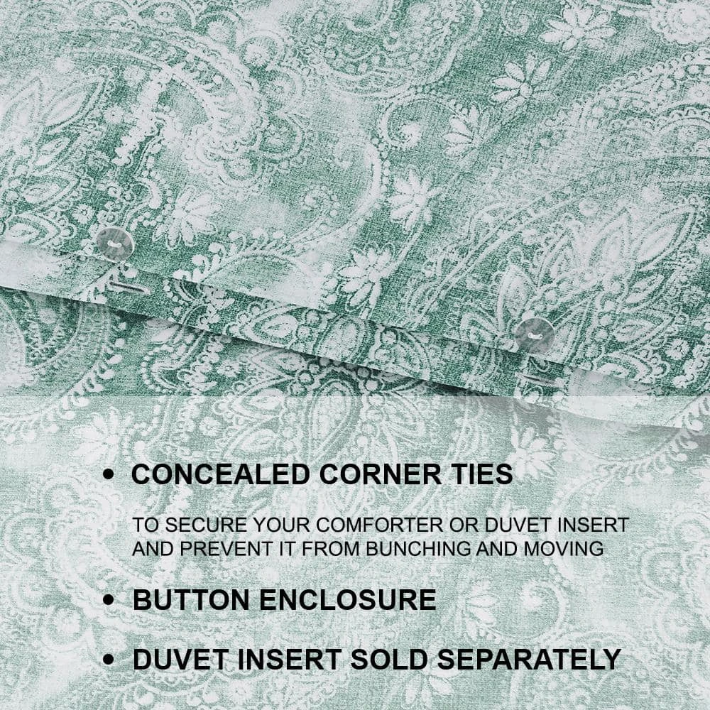Elevate your space with the Home Decorators Collection Isabel 3-Piece Teal Boho Paisley Floral Duvet Cover Set. Made of luxurious, 100% cotton sateen fabrication, this duvet cover set is buttery soft and perfect for year round use. The duvet cover features a teal paisley floral design that makes it easy to freshen up your bed. The button closure and corner ties keep your duvet insert or comforter in place without bunching. This 3-piece set includes one king duvet cover and two king shams. Machine washable for easy care.