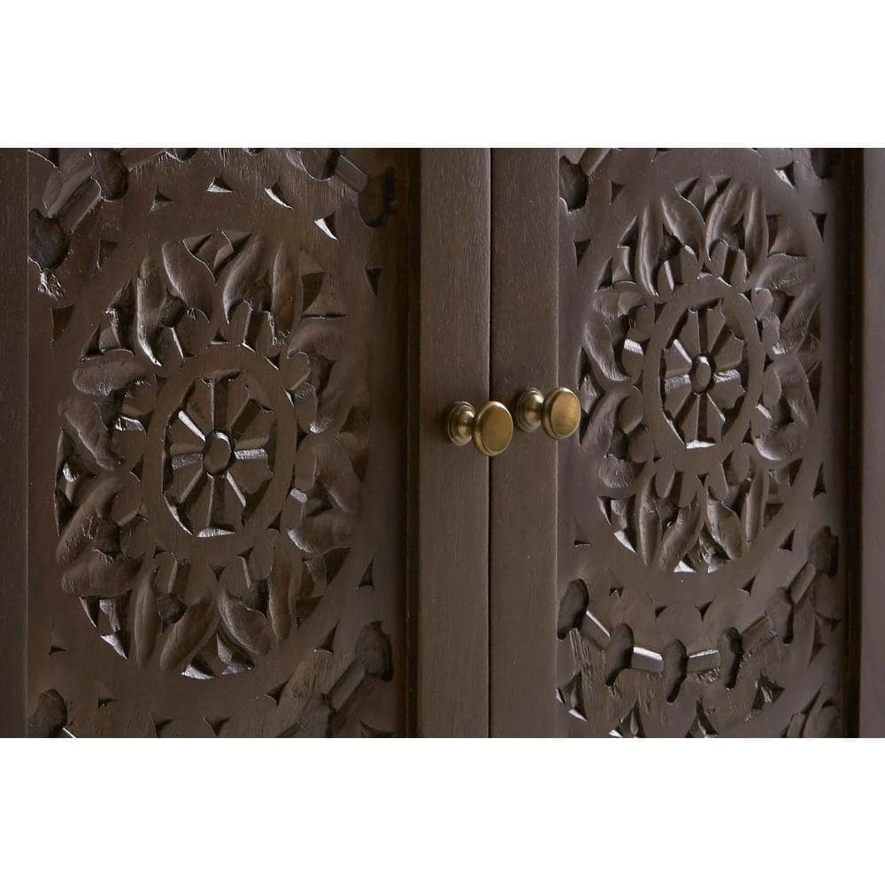 This hand carved solid wood nightstand is the perfect, stylish addition to any bedroom. Features two carved doors with an antique finished knobs. The top offers plenty of space to for a lamp, books and more, while the interior adjustable shelf provides additional storage. Crafted of solid mango wood. Fully assembled.