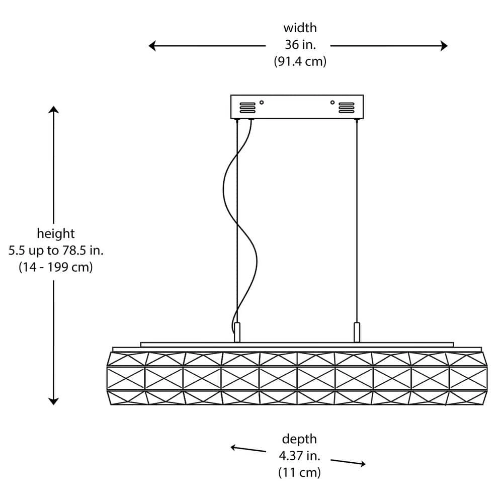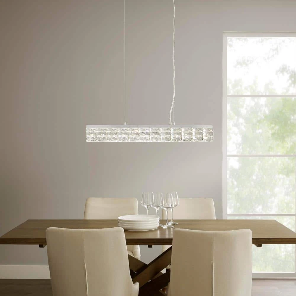 The Keighley series from Home Decorators Collection offers glamorous, crystal shaded interior lighting for every room of the house. The Keighley LED island chandelier features a polished chrome finish and elongated linear shade made of crystal plates. Light from the integrated LEDs sparkles brightly out from the shade while the polished chrome hardware reflects the light for even brighter illumination. The 36 inch length of this piece makes it ideal for hanging over kitchen islands or dining room tables. The integrated LED module is low maintenance and means you will never have to change bulbs for the life of the fixture. This linear chandelier is height adjustable using the included hanging wire, and is easy to install. For coordinating crystal lighting, shop the Keighley Collection.