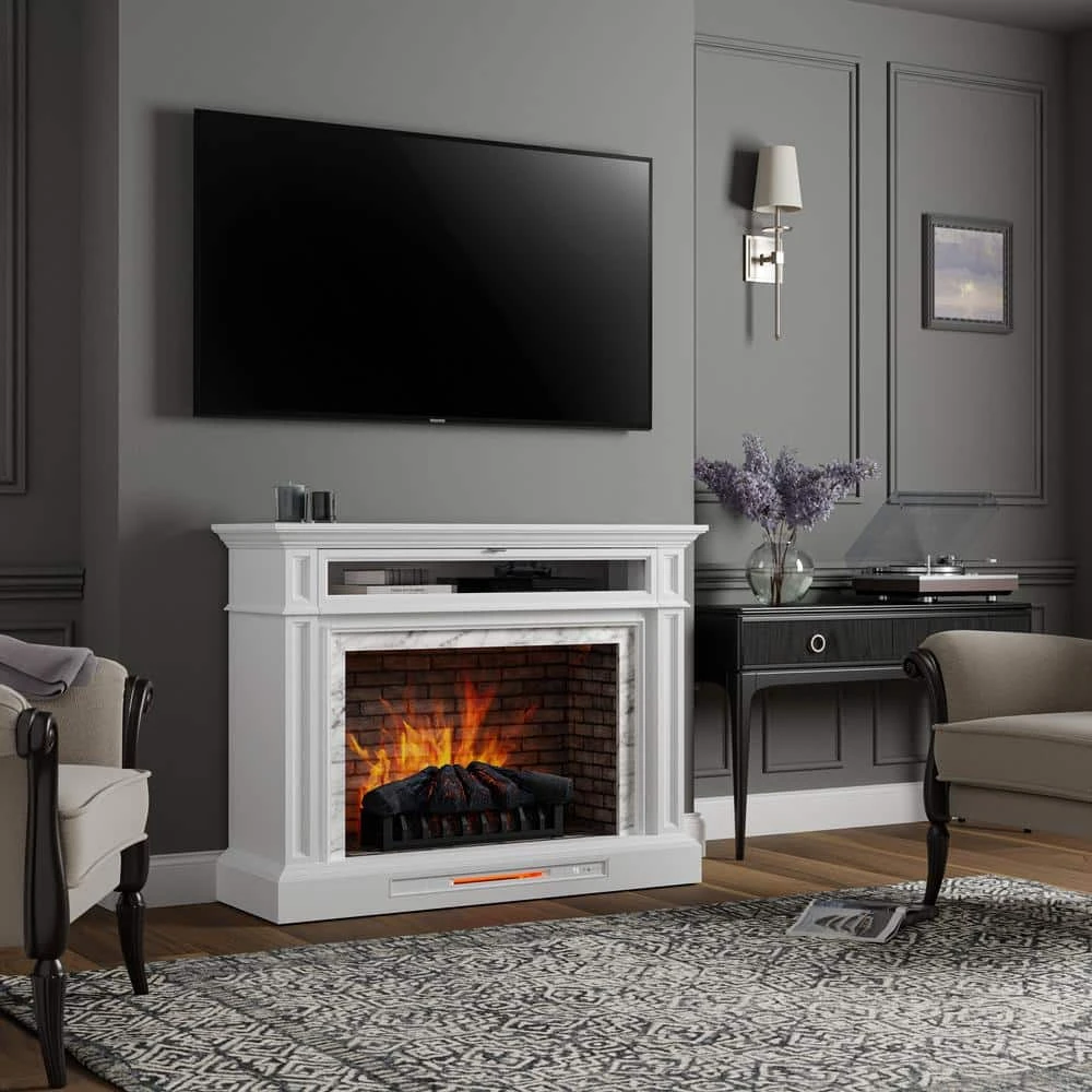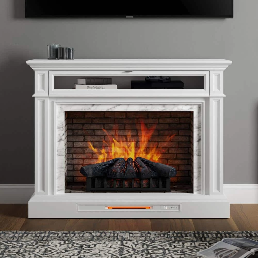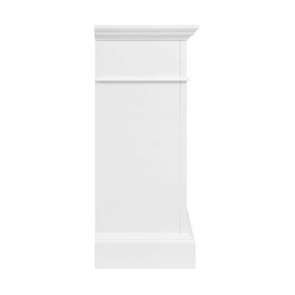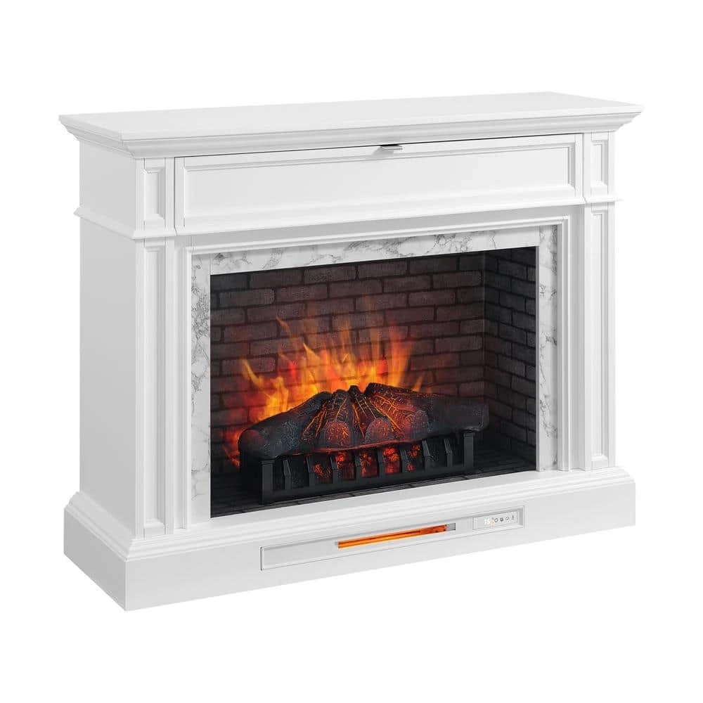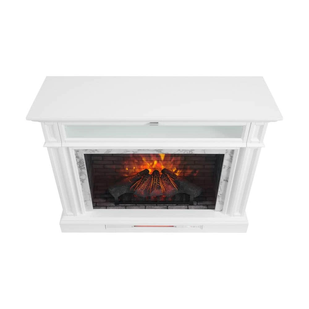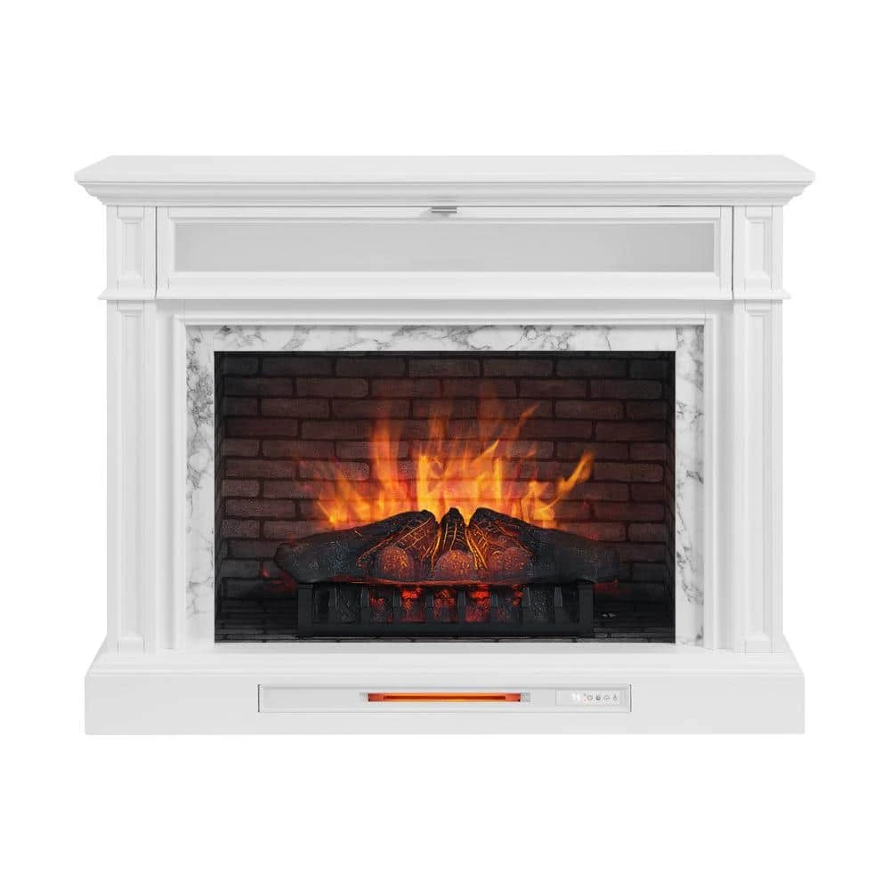 Bring an upscale feel to any room in your home with this freestanding electric fireplace TV stand. Its transitional styling, white finish and faux Carrara marble surround are sure to make it the focal point of any room in your home. A flip down drawer with interchangeable wood or glass inserts opens to reveal a generous interior storage shelf. A 33 in. infrared electric insert adds ambiance and warmth that can be enjoyed all year round. Smaller details, like hand crafted moldings, soft close hardware and solid wood door frames make this fireplace a winner in design and value.