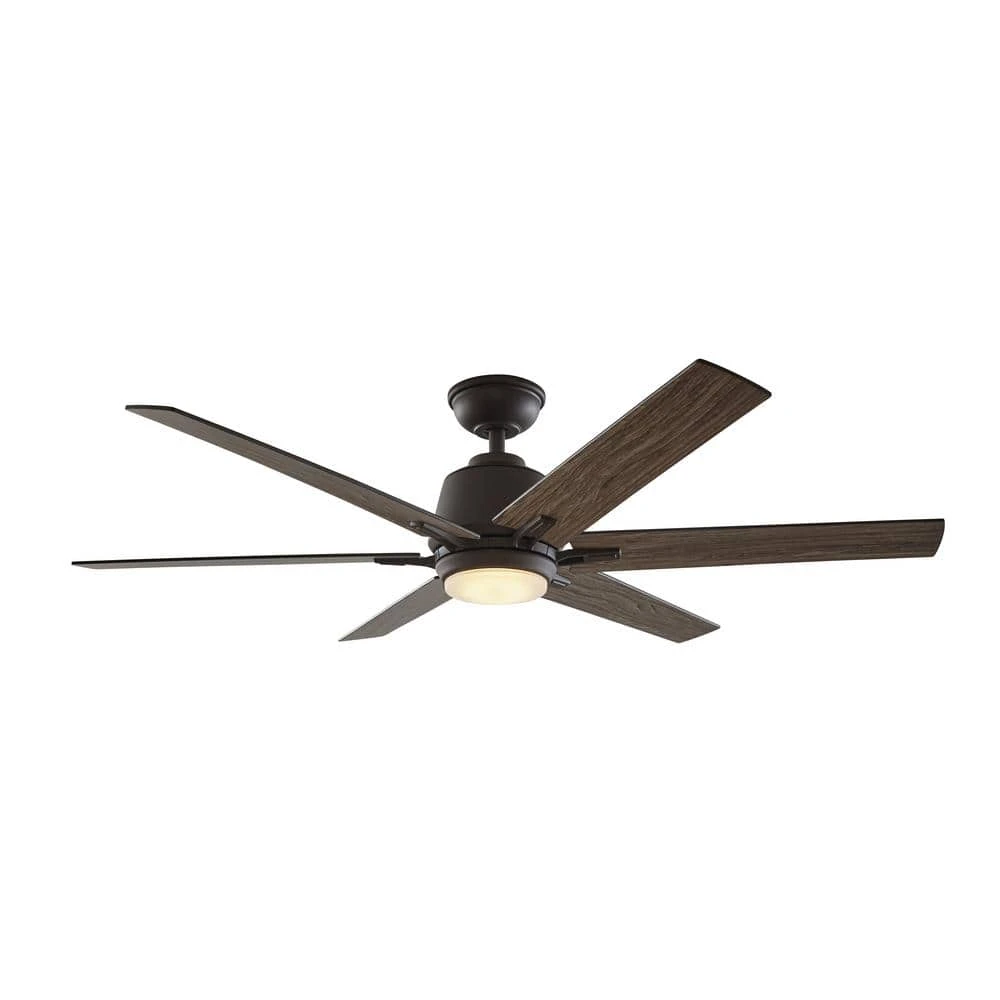 Easily integrate fan and light control into your Amazon or Google smart home system with this Bond ceiling fan bundle. The Bond remote control hub pairs with Alexa or Google Home to add voice control convenience to your ceiling fan. The Home Decorators Collection Kensgrove 54 in. Espresso Bronze ceiling fan is great for large areas and lofts. The dome style light kit with frosted glass includes a 14-Watt LED Samsung light source and is set at 3000K temperature (warm white). Also this DC motor has 9 speeds which are three times as many as traditional ceiling fans have. The hand held remote control will control the dimming and speed function, battery included. The ceiling fan and BOND hub ship separately. DC motor fans are 70% more energy efficient than AC motor fans (when comparing efficiency (CFM/W) of DC vs AC motors in published FTC Energy Guides for ceiling fans).