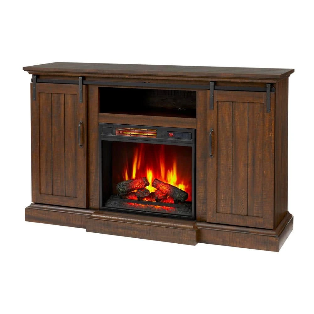 Get a modern Farmhouse look with this sliding barn door TV stand with integrated USB charging. The Kerrington is a must-have TV stand with electric fireplace for TVs up to 65 in. and 60 lbs., A concealed charging station built into the media bay helps you keep devices charged with 2 USB ports. The 2 sliding barn doors roll to the center for access to 2-side cabinets concealed by touch latch doors. Safer Plug and Safer Sensor fire prevention technologies gives you peace of mind. Safer Plug monitors the temperature of the plug and shuts off automatically if unsafe conditions arise. Safer Sensor alerts you when the heater is obstructed and will automatically shut off to prevent damage. Spectrafire 3D flame effect technology offers 3 blue and 3 amber effect options to create your ideal fire, displayed on a realistic log set and ember bed. The flame effects can be used with or without heat for year-round enjoyment.