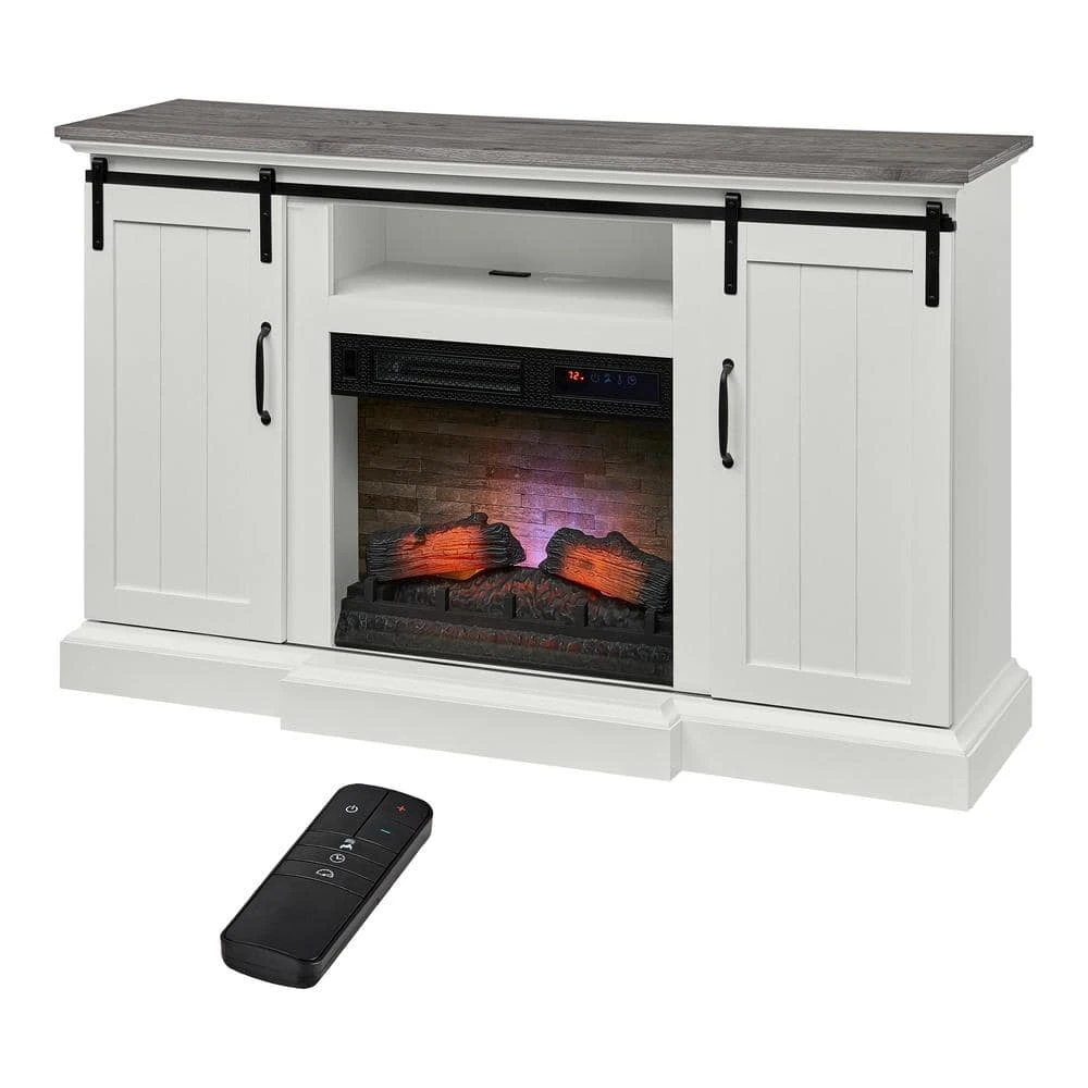 Get a modern Farmhouse look with this sliding barn door TV stand with integrated USB charging. The Kerrington is a must-have TV stand with electric fireplace for TVs up to 65 in. and 60 lbs. A concealed charging station built-into the media bay helps you keep devices charged with 2 USB ports. The 2 sliding barn doors roll to the center for access to 2-side cabinets concealed by touch latch doors. Safer Plug and Safer Sensor fire prevention technologies gives you peace of mind. Safer Plug monitors the temperature of the plug and shuts off automatically if unsafe conditions arise. Safer Sensor alerts you when the heater is obstructed and will automatically shut off to prevent damage. Spectrafire 3D flame effect technology offers 3 blue and 3 amber effect options to create your ideal fire, displayed on a realistic log set and ember bed. The flame effects can be used with or without heat for year-round enjoyment.