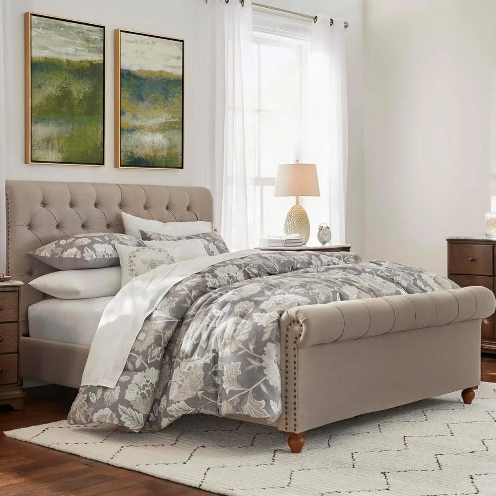 Turn your bed into a stunning focal point with the Larkspur 5-Piece Stone Gray and Khaki King Comforter Set. It features a 100% cotton sateen construction for warmth and softness. A distressed floral print provides a modern farmhouse aesthetic. It’s grand scale and texture will add the perfect finishing touch to your suite. This 5-piece set includes a comforter, two shams and two square decorative pillows. STANDARD 100 by OEKO-TEX [19.HUS.68942 Hohenstein HTTI].