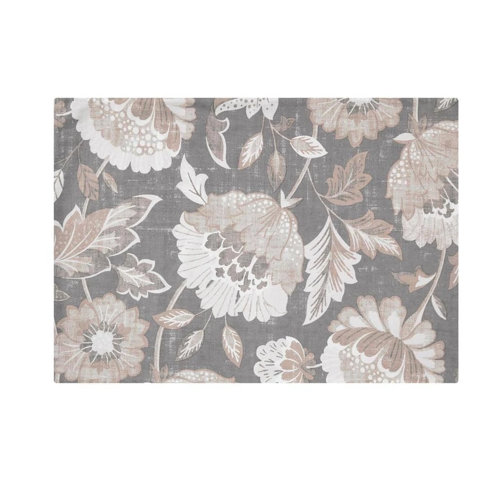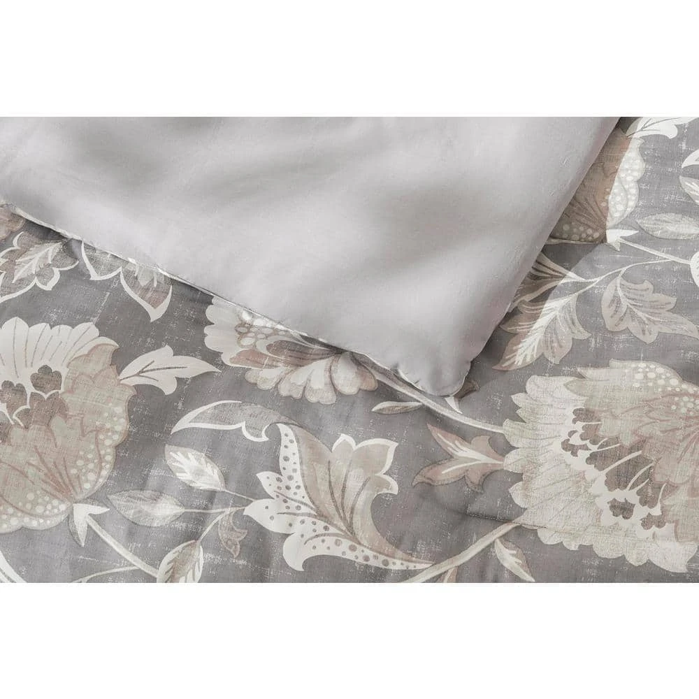 - The comforter’s large scale floral print has a dark, warm gray background. The overall neutral accents include beige, taupe, gray, and ivory.
