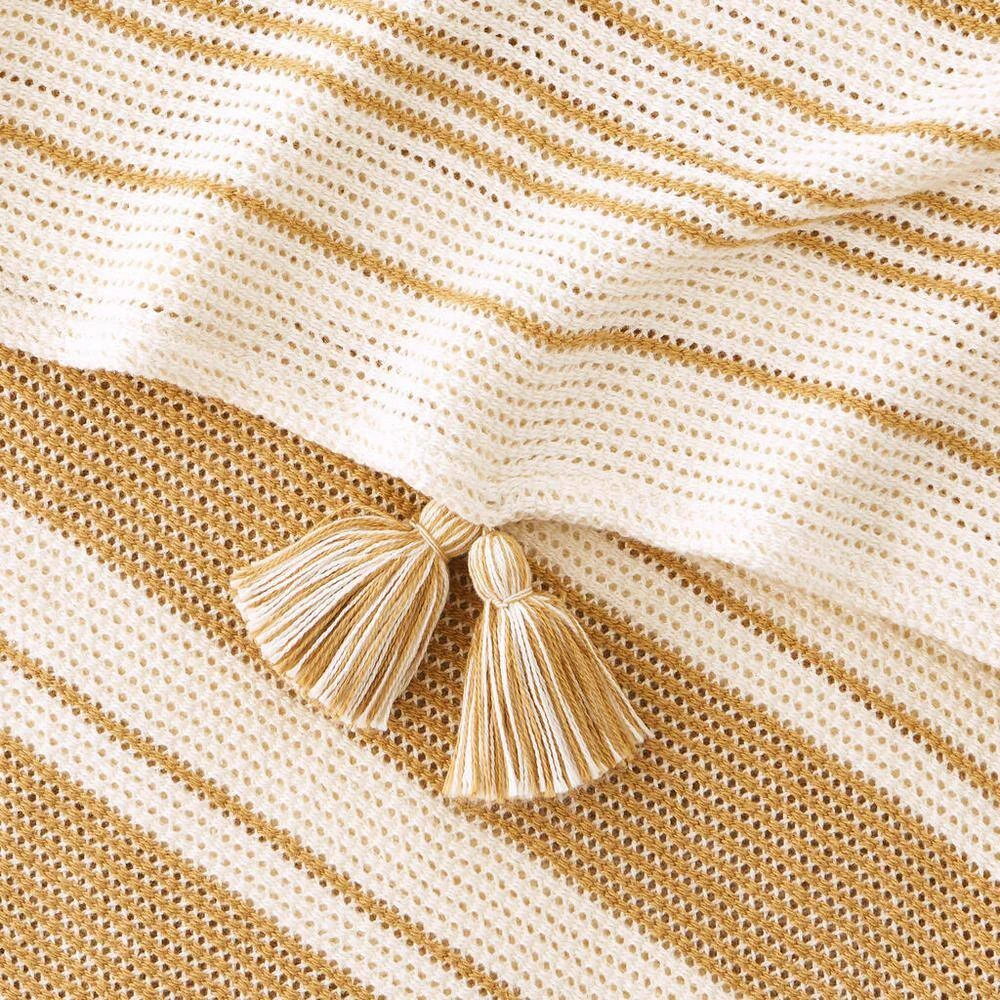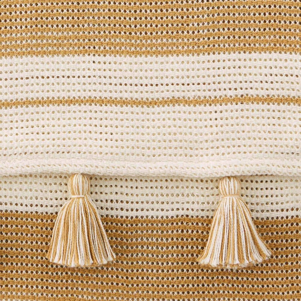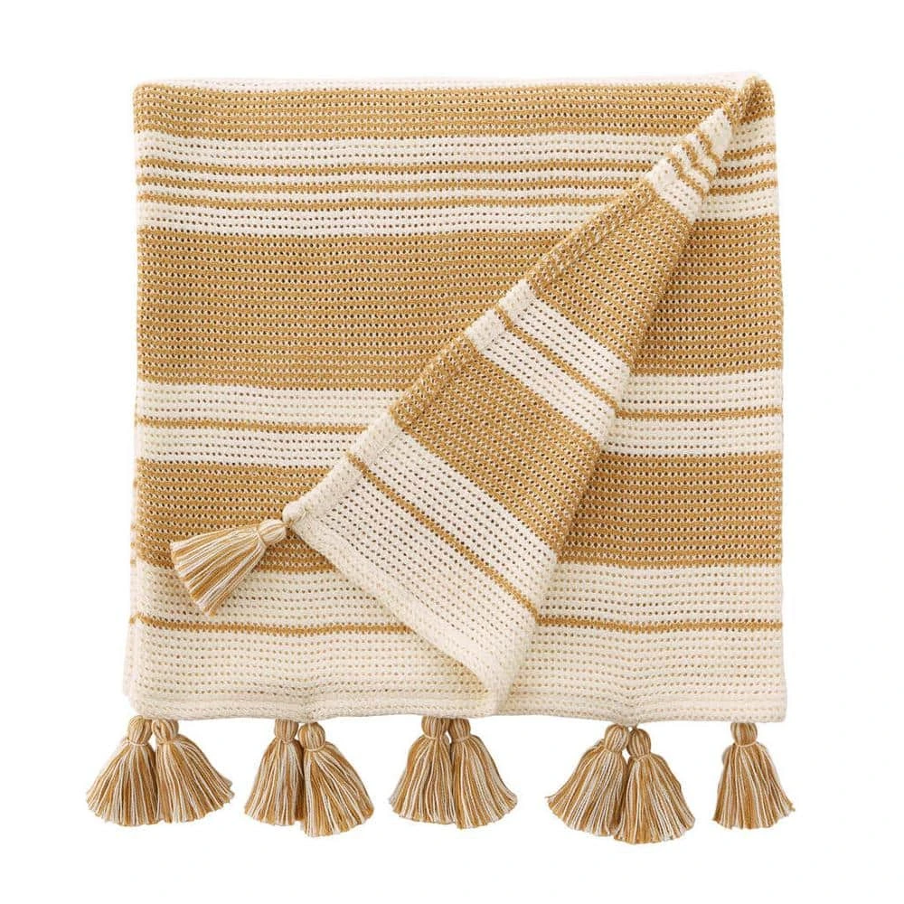 Combine cozy comfort and style with this Home Decorators Collection Light Brown Stripe Turkish Cotton Textured Throw Blanket with Tassels. Crafted from soft and breathable cotton, this woven throw blanket is the perfect addition to a chilly night or even a cool summer evening. Drape this light brown neutral boho throw blanket over the back of a chair, your couch, or your bed to easily grab when cozying up to watch your favorite show or reading a good book. The tassels will add a stylish look to your space, and the soft material will provide a cozy feel for ultimate relaxation. This light brown stripe woven throw blanket measures 50 in. wide x 70 in. long. Our Turkish cotton throw blanket is durable for year-round use and machine washable for easy care. Certified Standard 100 by OEKO-TEX.