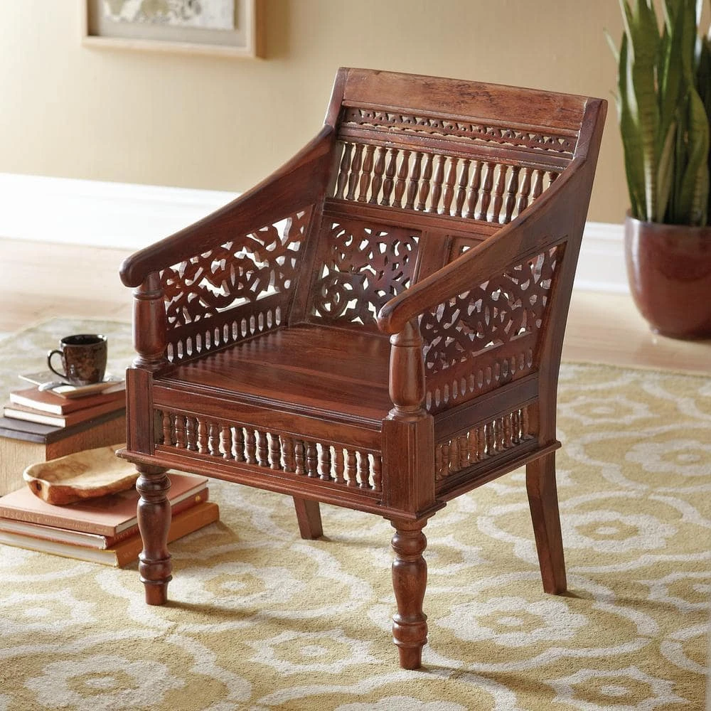 You’ll love the attention to detail in our exquisite Hand-Carved Maharaja Chair. The intricate design features sweeping lines, meticulous cutout fretwork, rows of small turned spindles and bold, turned front legs. Whether used as a focal point in your living room, as an office chair or even at the end of your dining table, this handmade piece will elevate your decor to extraordinary.